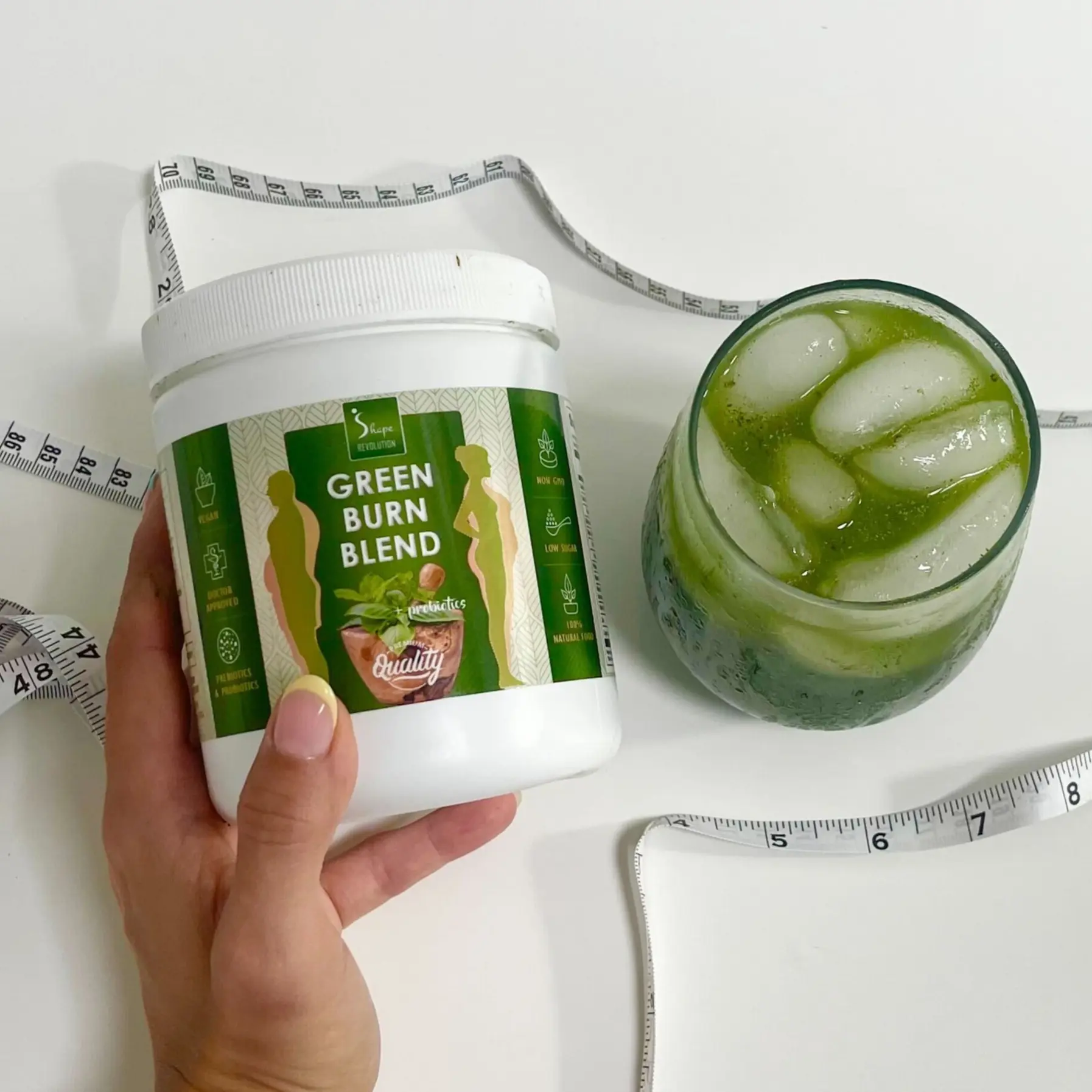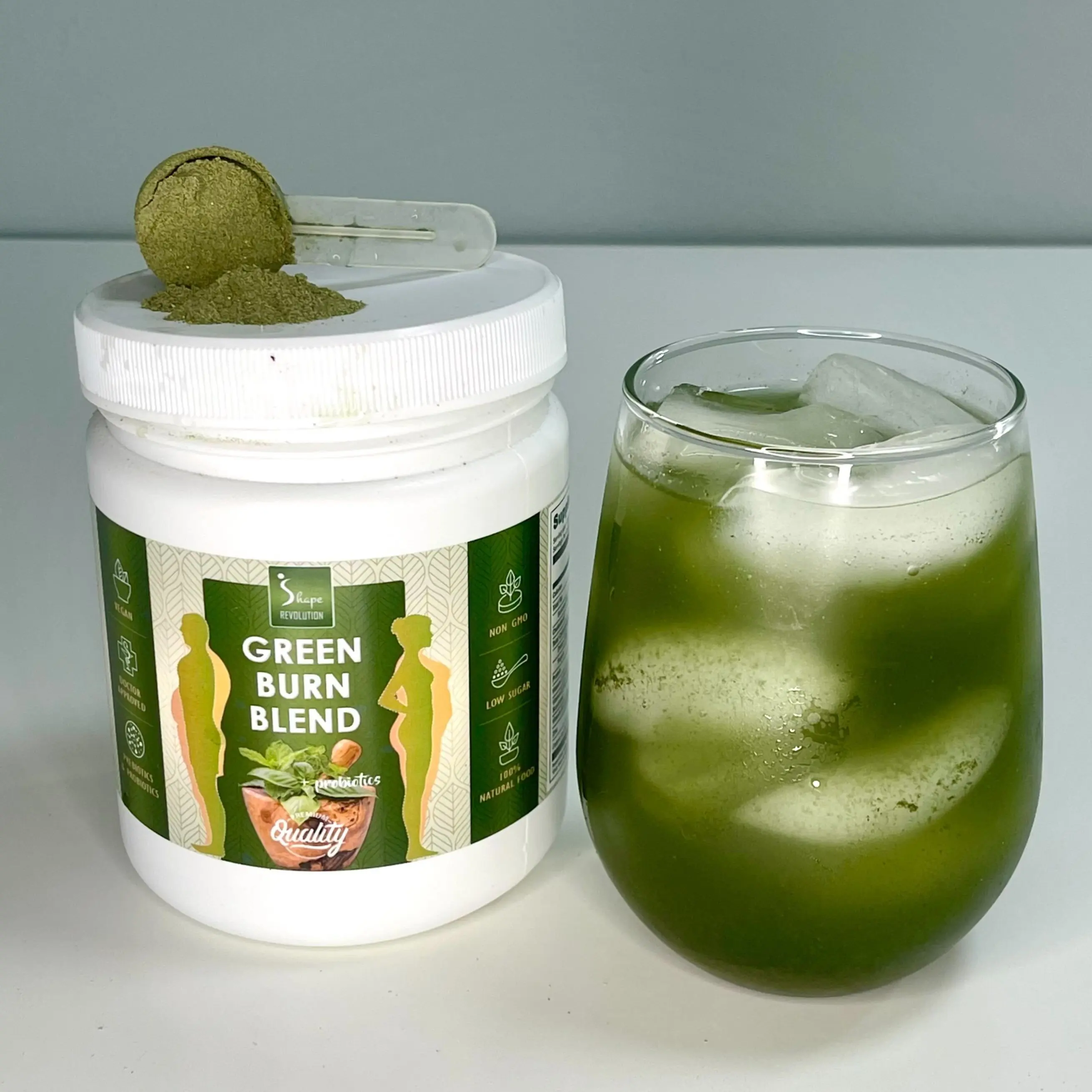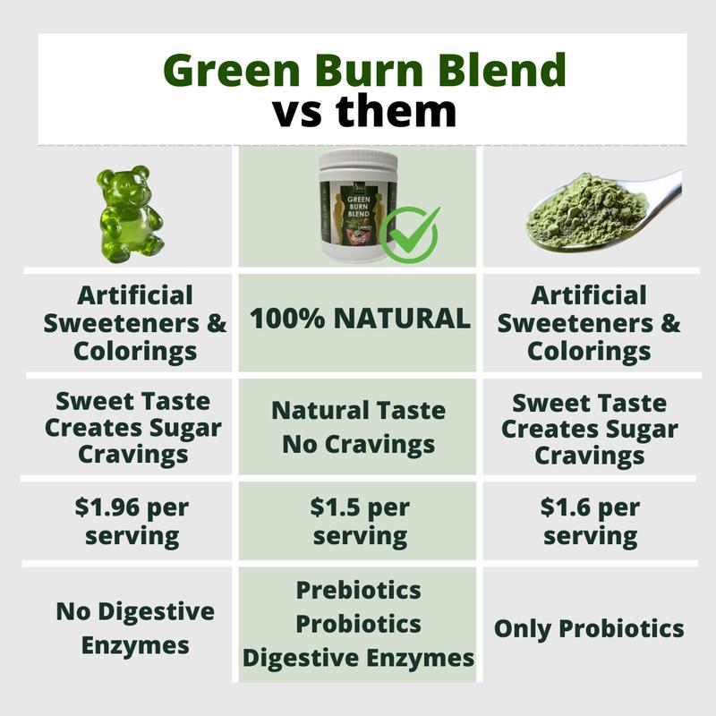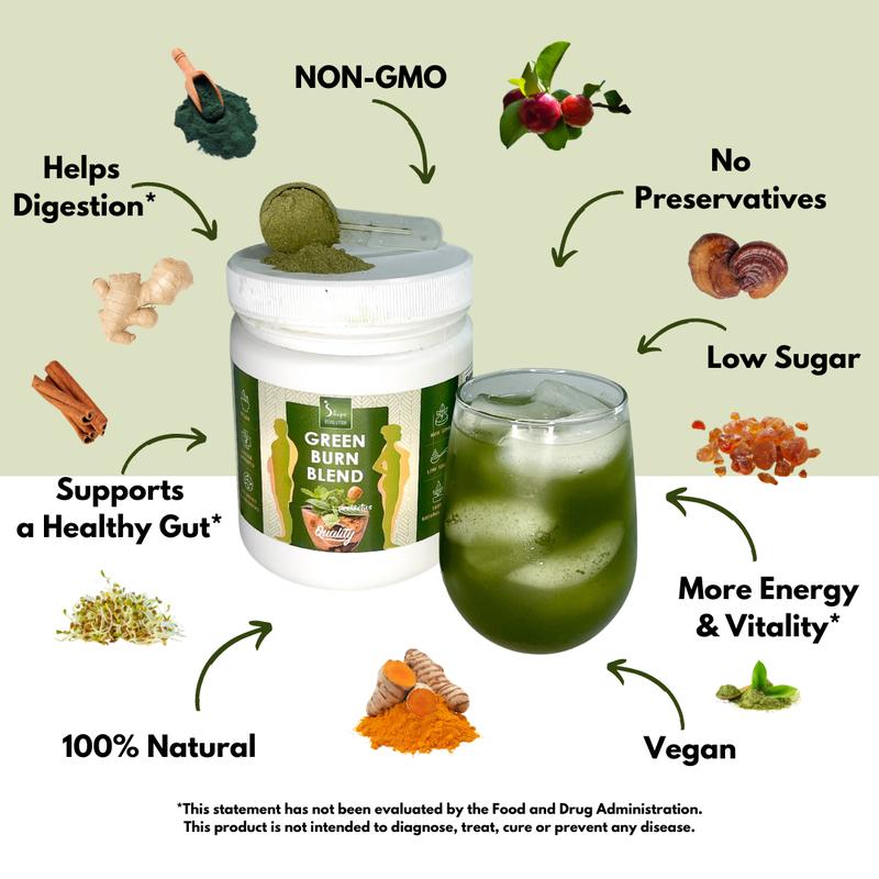 A single serving of Green Burn Blend provides you with vitamins, minerals, nutrients, adaptogens, antioxidants, fiber, prebiotics, probiotics, and digestive enzymes.