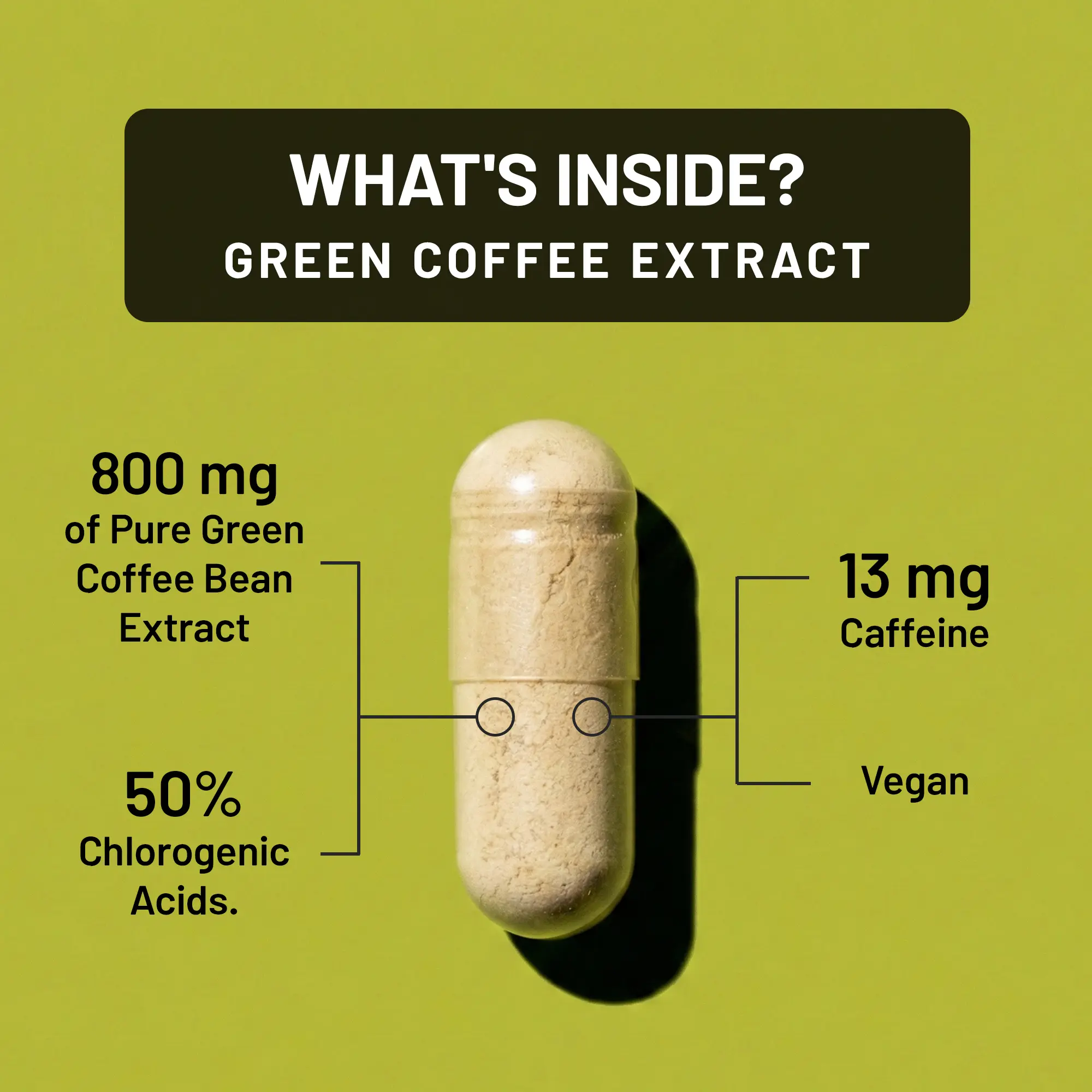 Green coffee bean extract is extracted from raw, unroasted coffee beans, which have a higher level of chlorogenic acid than roasted beans. Our formula contains 800 mg of pure green coffee extract per serving, a standardized extract with a potent 50% concentration of chlorogenic acids.