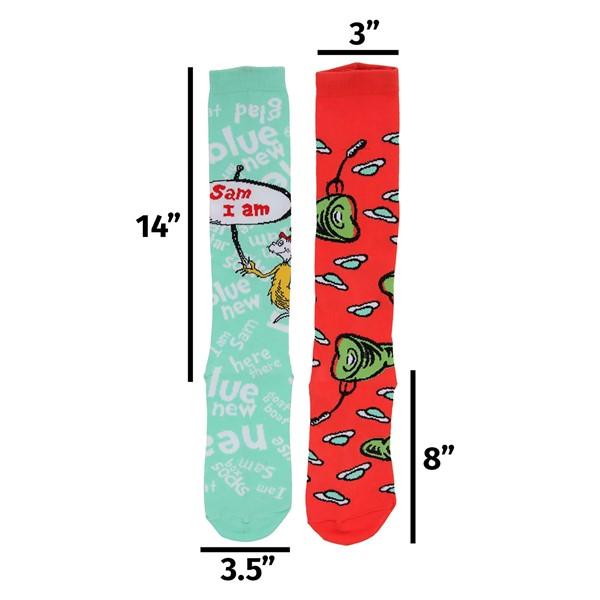 These knee highs have both different colors and different graphics from each other. One sock is red and features the dreaded green eggs and ham in a design that repeats all the way around the sock. The other sock is a light teal, and features Sam-I-Am holding a sign with his name on it. It also has different rhyming words knitted in white as a background pattern. If you're a Dr. Seuss fan, this bold pair is definitely for you! Are you looking for other Dr. Seuss pieces? Check out our website for more kooky Seuss items. Whether you're looking for Thing One gloves or Cat in the Hat stripes, we've got you covered!