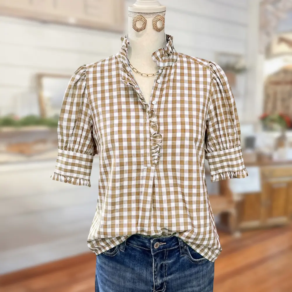 • Storybook charm – The ruffled neckline and checks evoke pastoral picnics or Parisian cafés.