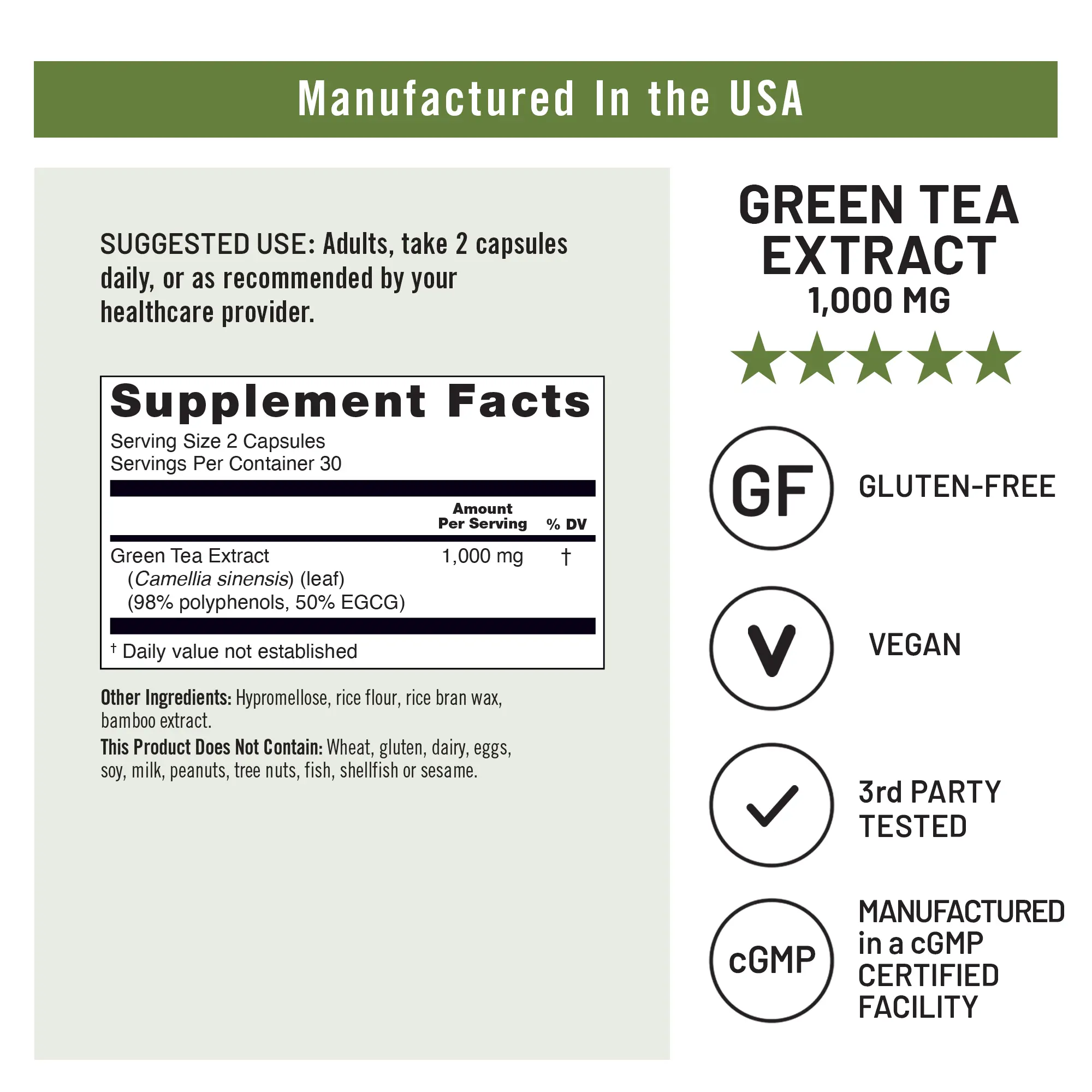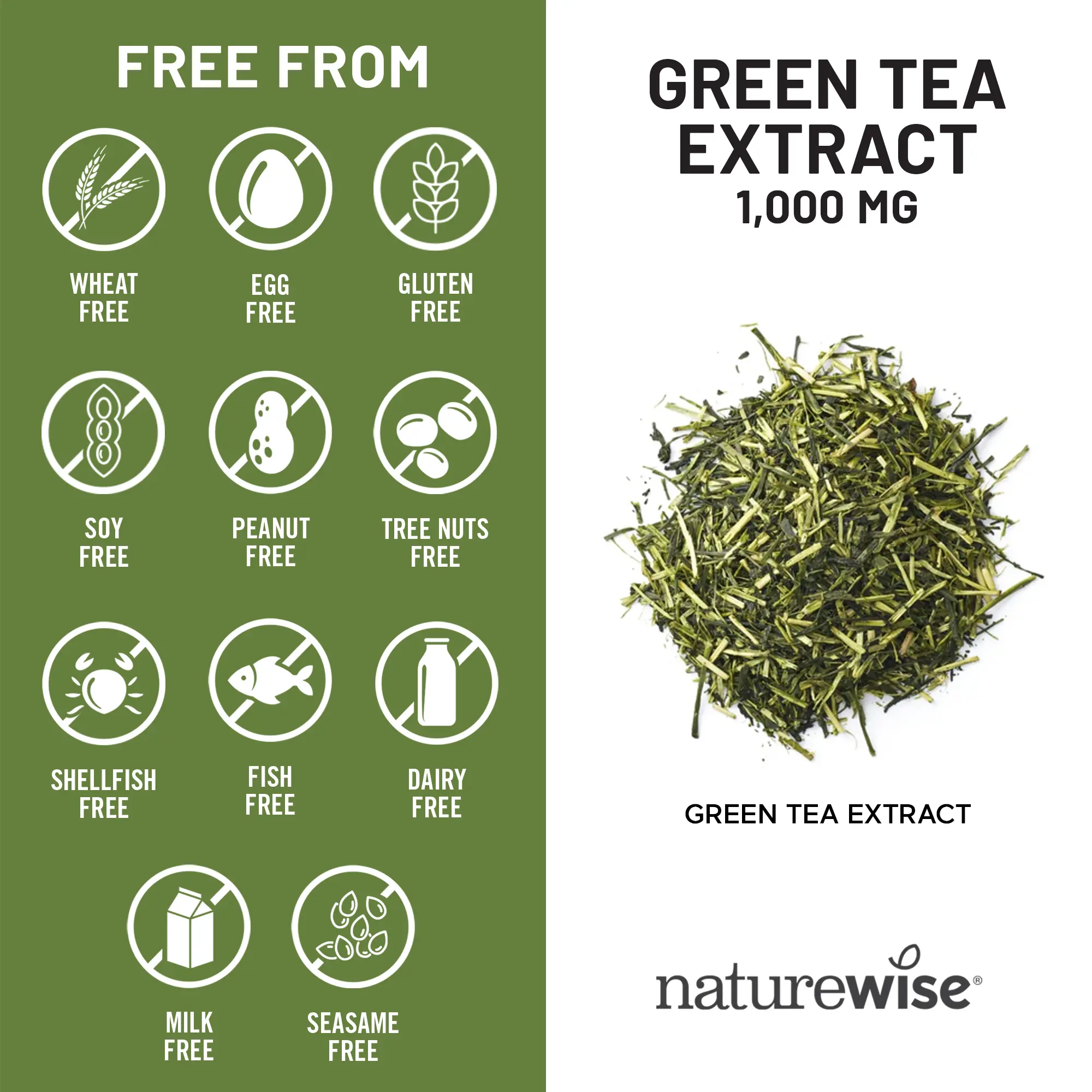 This product is vegan, gluten-free, and does not contain wheat, eggs, soy, dairy, tree nuts, peanuts, fish, shellfish, or sesame. NatureWise Green Tea Extract capsules are manufactured in the USA with high-quality ingredients from around the world in a cGMP-certified facility with third-party quality control audits.