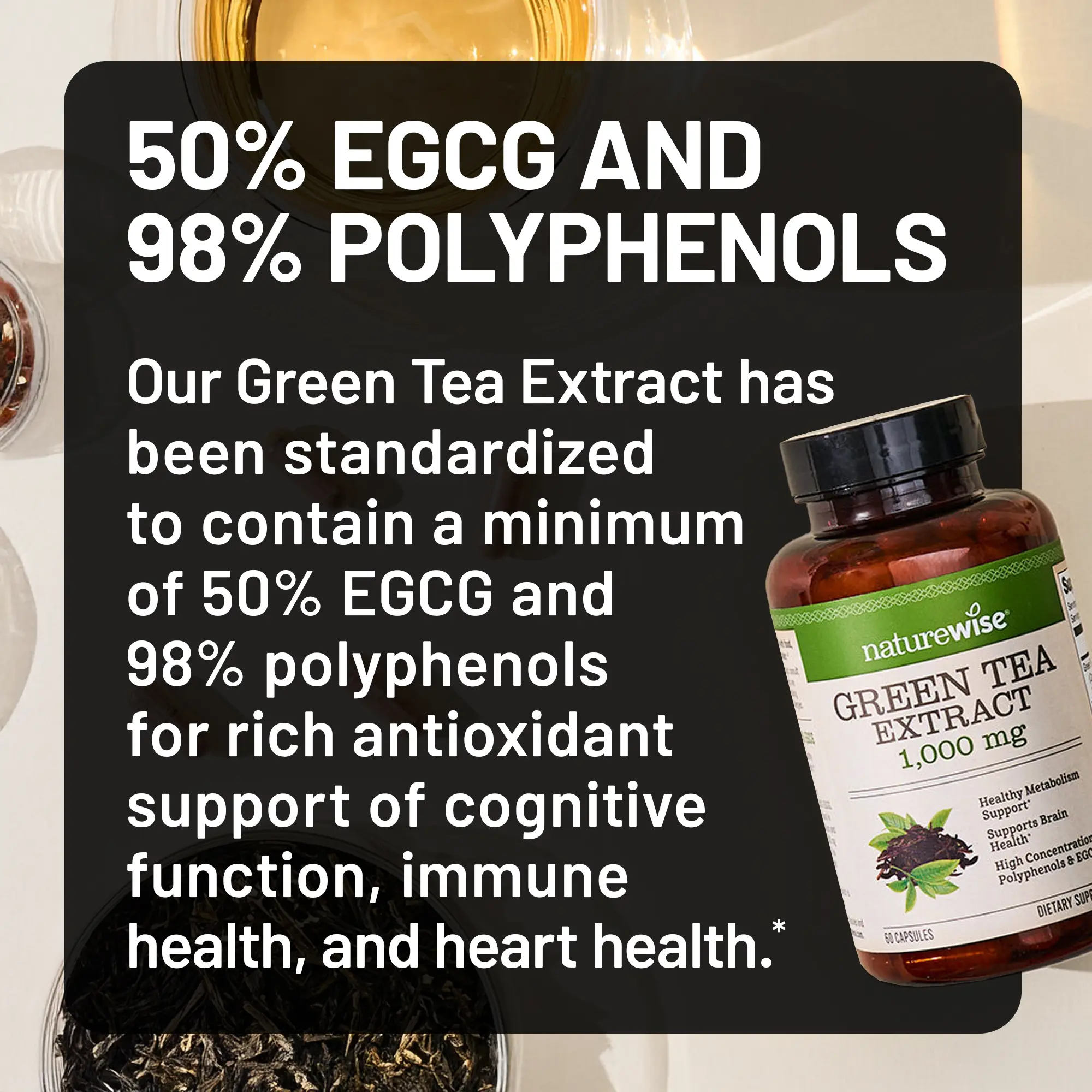 ·50% EGCG AND 98% POLYPHENOLS: Green Tea Extract has been standardized to contain a minimum of 50% EGCG and 98% polyphenols for rich antioxidant support of cognitive function, immune health, and heart health.*