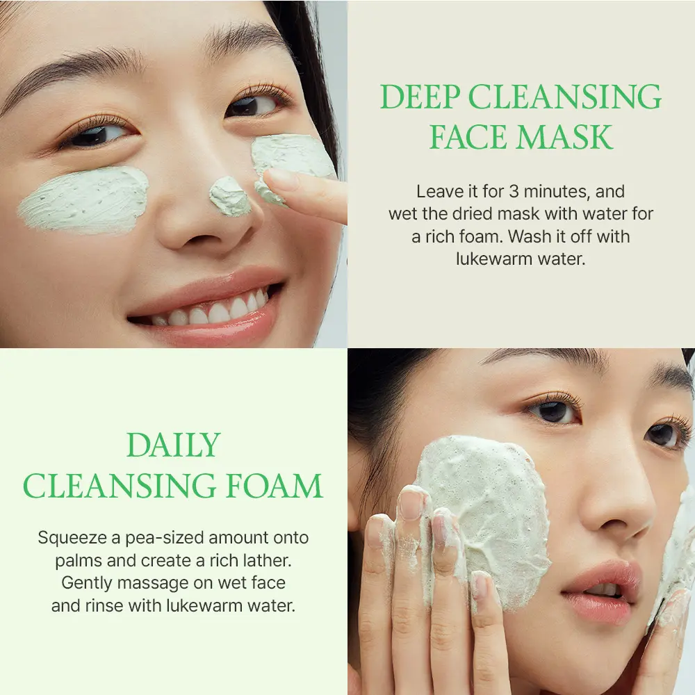 ·Daily Cleansing Foam: Squeeze a pea-sized amount onto palms and create a rich lather. Gently massage on wet face and rinse with lukewarm water.