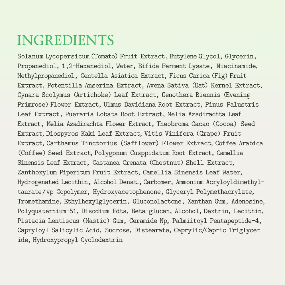 | Ingredients | HYDROXYPROPYL CYCLODEXTRIN,CAPRYLIC/CAPRIC TRIGLYCERIDE,SUCROSE DISTEARATE,CAPRYLOYL SALICYLIC ACID,PALMITOYL PENTAPEPTIDE-4,CERAMIDE NP,PISTACIA LENTISCUS (MASTIC) GUM,LECITHIN,DEXTRIN,ALCOHOL,BETA-GLUCAN,DISODIUM EDTA,POLYQUATERNIUM-51,ADENOSINE,XANTHAN GUM,GLUCONOLACTONE,ETHYLHEXYLGLYCERIN,TROMETHAMINE,GLYCERYL POLYMETHACRYLATE,HYDROXYACETOPHENONE,AMMONIUM ACRYLOYLDIMETHYLTAURATE/VP COPOLYMER,CARBOMER,ALCOHOL DENAT.,HYDROGENATED LECITHIN,CAMELLIA SINENSIS LEAF WATER,ZANTHOXYLUM PIPERITUM FRUIT EXTRACT,CASTANEA CRENATA (CHESTNUT) SHELL EXTRACT,CAMELLIA SINENSIS LEAF EXTRACT,POLYGONUM CUSPIDATUM ROOT EXTRACT,COFFEA ARABICA (COFFEE) SEED EXTRACT,CARTHAMUS TINCTORIUS (SAFFLOWER) FLOWER EXTRACT,VITIS VINIFERA (GRAPE) FRUIT EXTRACT,DIOSPYROS KAKI LEAF EXTRACT,THEOBROMA CACAO (COCOA) SEED EXTRACT,MELIA AZADIRACHTA FLOWER EXTRACT,MELIA AZADIRACHTA LEAF EXTRACT,PUERARIA LOBATA ROOT EXTRACT,PINUS PALUSTRIS LEAF EXTRACT,ULMUS DAVIDIANA ROOT EXTRACT,OENOTHERA BIENNIS (EVENING PRIMROSE) FLOWER EXTRACT,CYNARA SCOLYMUS (ARTICHOKE) LEAF EXTRACT,AVENA SATIVA (OAT) KERNEL EXTRACT,POTENTILLA ANSERINA EXTRACT,FICUS CARICA (FIG) FRUIT EXTRACT,CENTELLA ASIATICA EXTRACT,METHYLPROPANEDIOL,NIACINAMIDE,BIFIDA FERMENT LYSATE,WATER,1,2-HEXANEDIOL,PROPANEDIOL,GLYCERIN,BUTYLENE GLYCOL,SOLANUM LYCOPERSICUM (TOMATO) FRUIT EXTRACT |