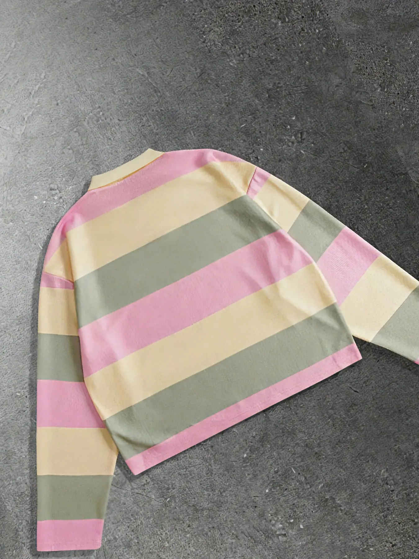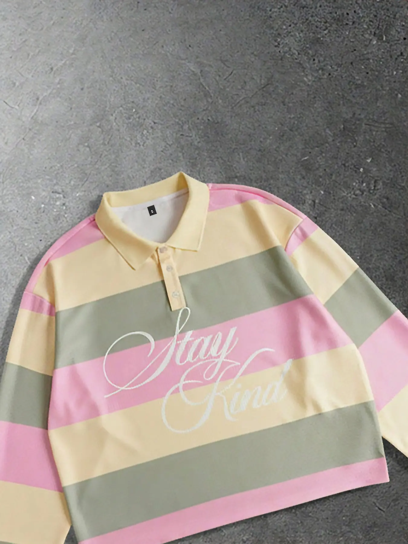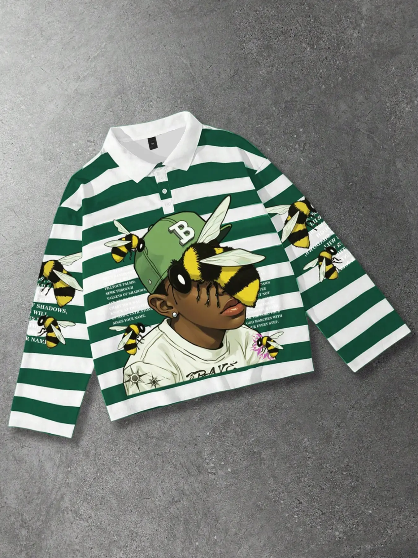 Green and white striped polo long sleeved men's T-shirt with rap bee print pattern and striped polo collar long sleeved shirt for European and American street life, unisex long T-shirt in ins style