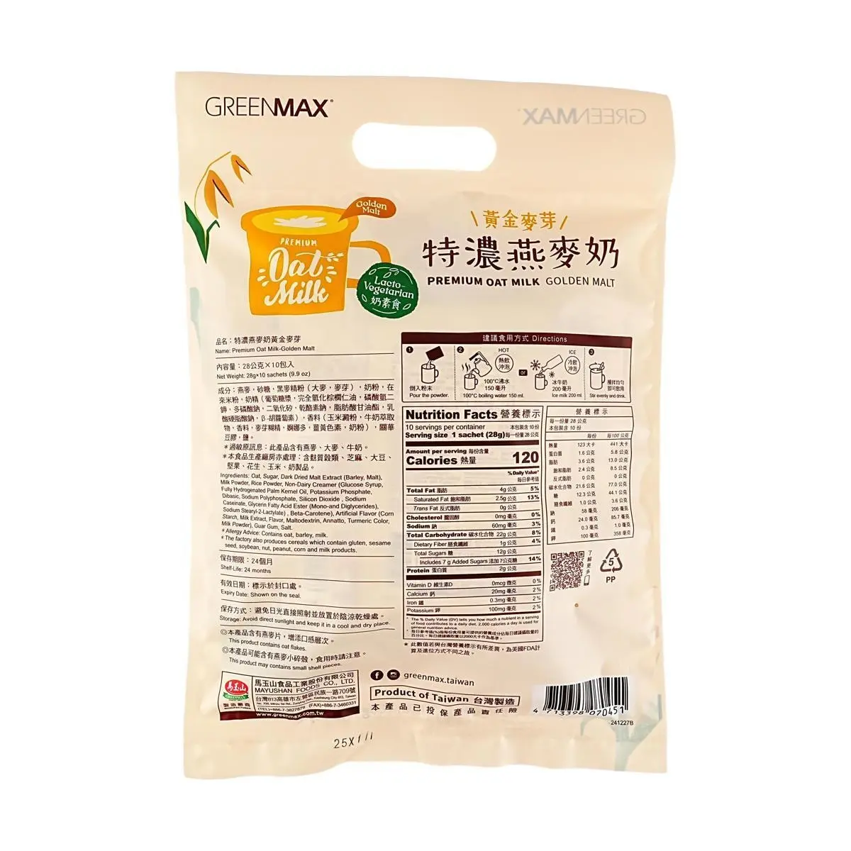 5. GREENMAX Taiwan Concentrated Oat Milk, Golden Malt Flavor, 10 Sachets, 280g - Rich & Creamy Breakfast Drink