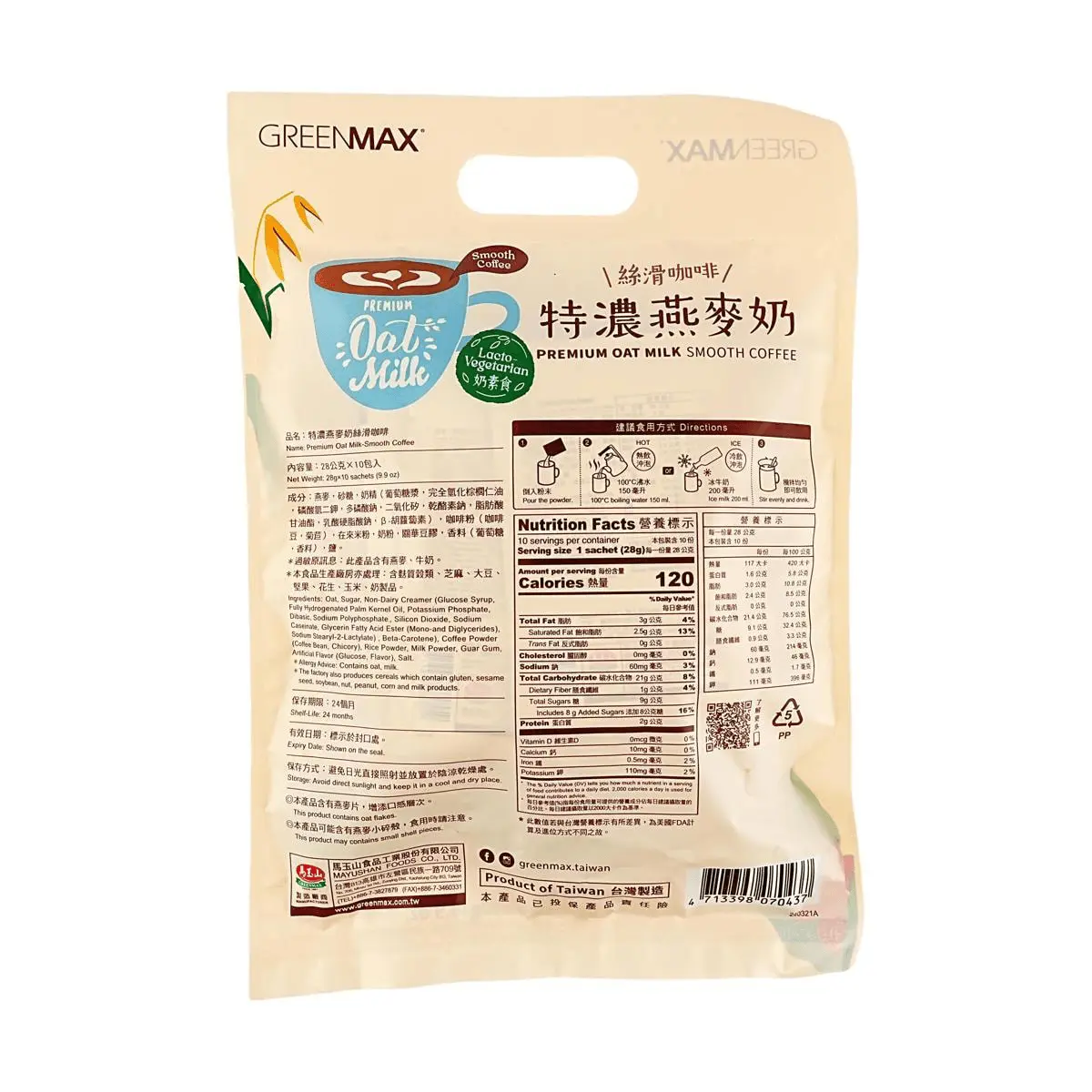 5. GREENMAX Taiwan Rich Oat Milk Coffee Flavor - Silky Smooth, 10 Sachets (280g) - Instant Healthy Beverage