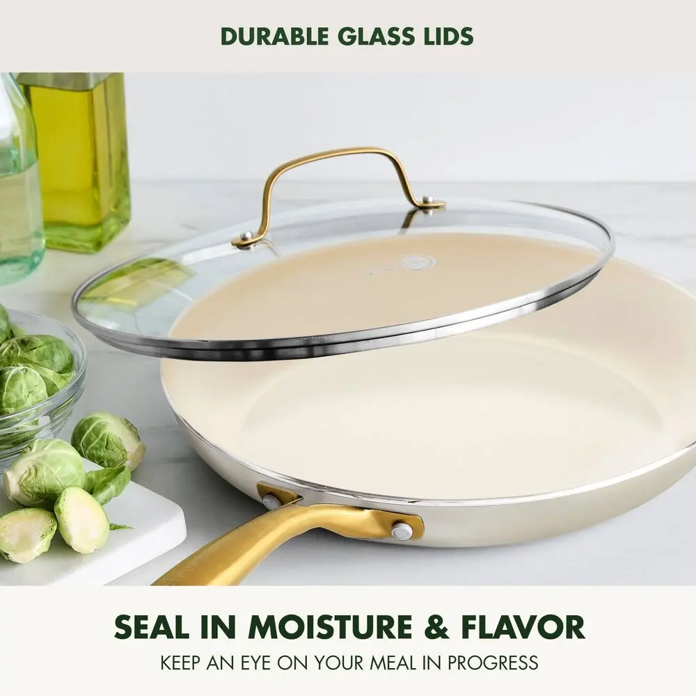 •Glass lids allow you to monitor the progress of your food; gold-tone stainless steel handles feature a corrosion resistant finish
