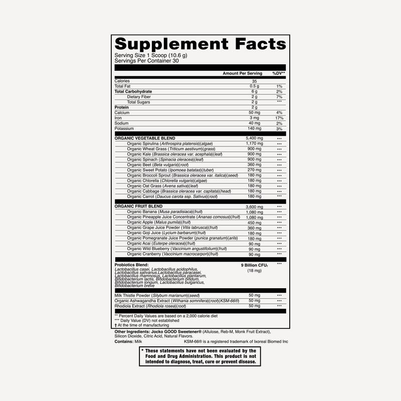 Holistic Health Support: A blend of 23 organic superfoods, including Spirulina, Wheat Grass, and Chlorella, to nourish your body.