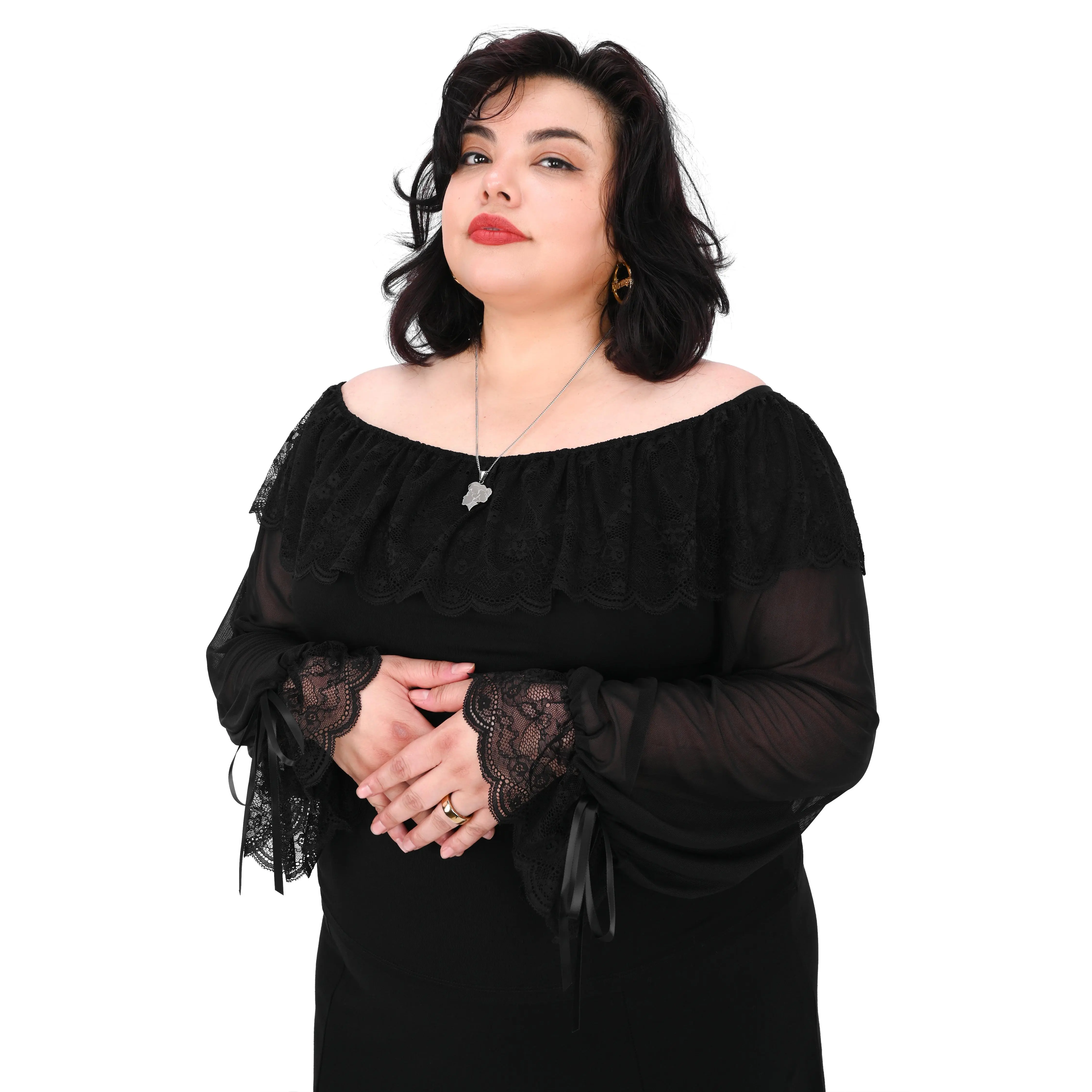 I had my eye on this too FOREVERRR and I finally treated myself. I’m 5’7 and i usually wear a 20-22, the 3XL fits me perfectly. The mesh sleeves are surprisingly soft and the pictures really don’t do justice to the details. I’m so excited to layer this with other dresses and tops! 🖤