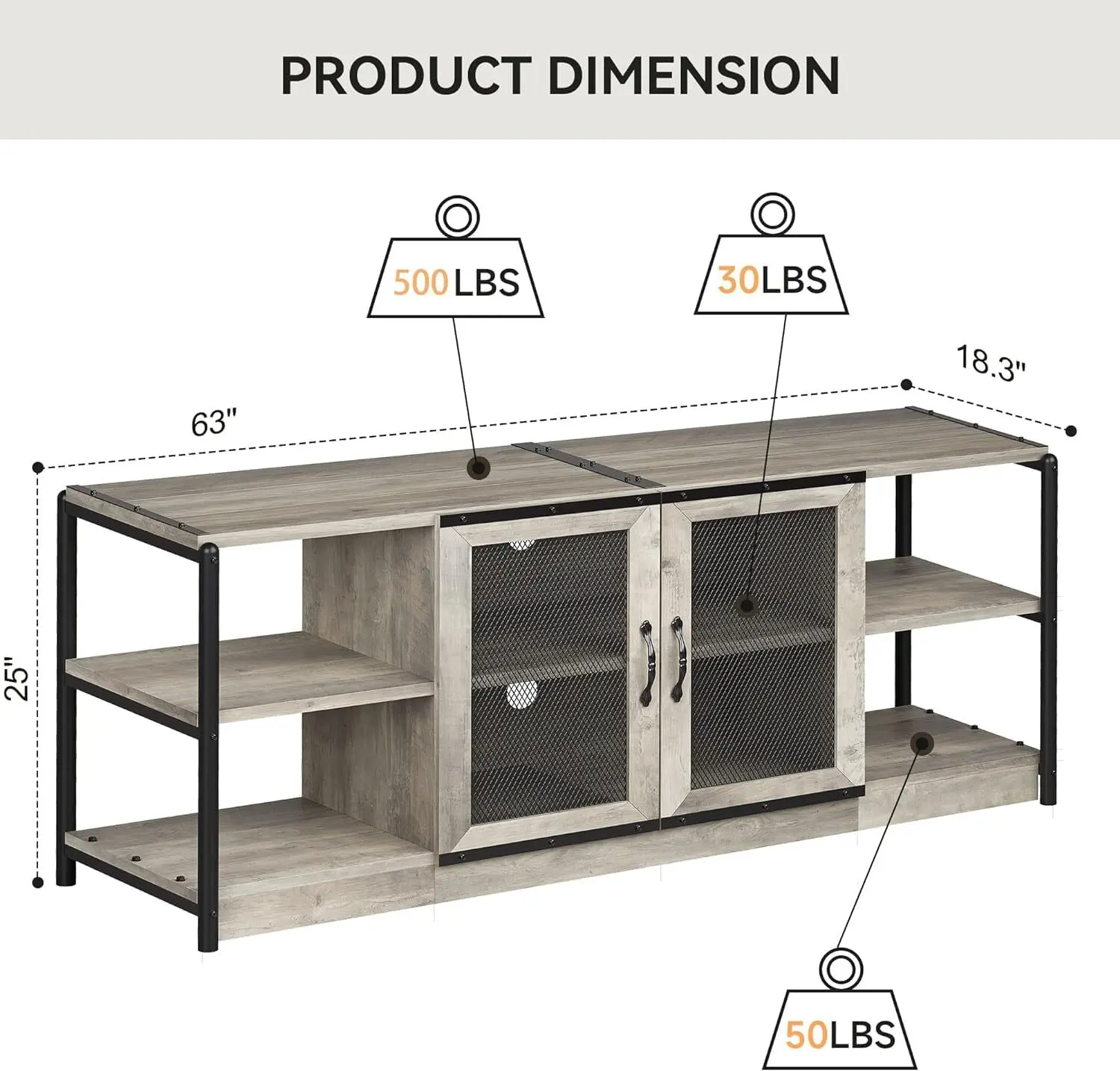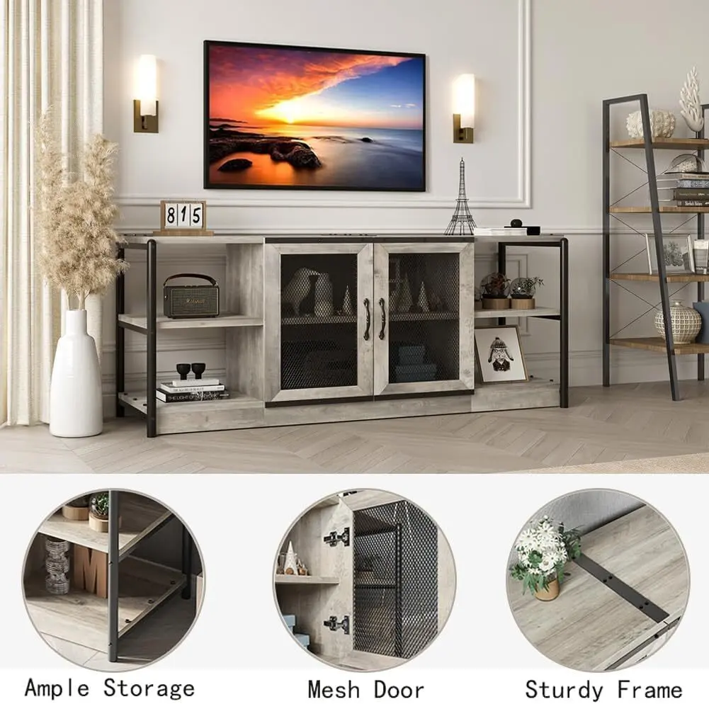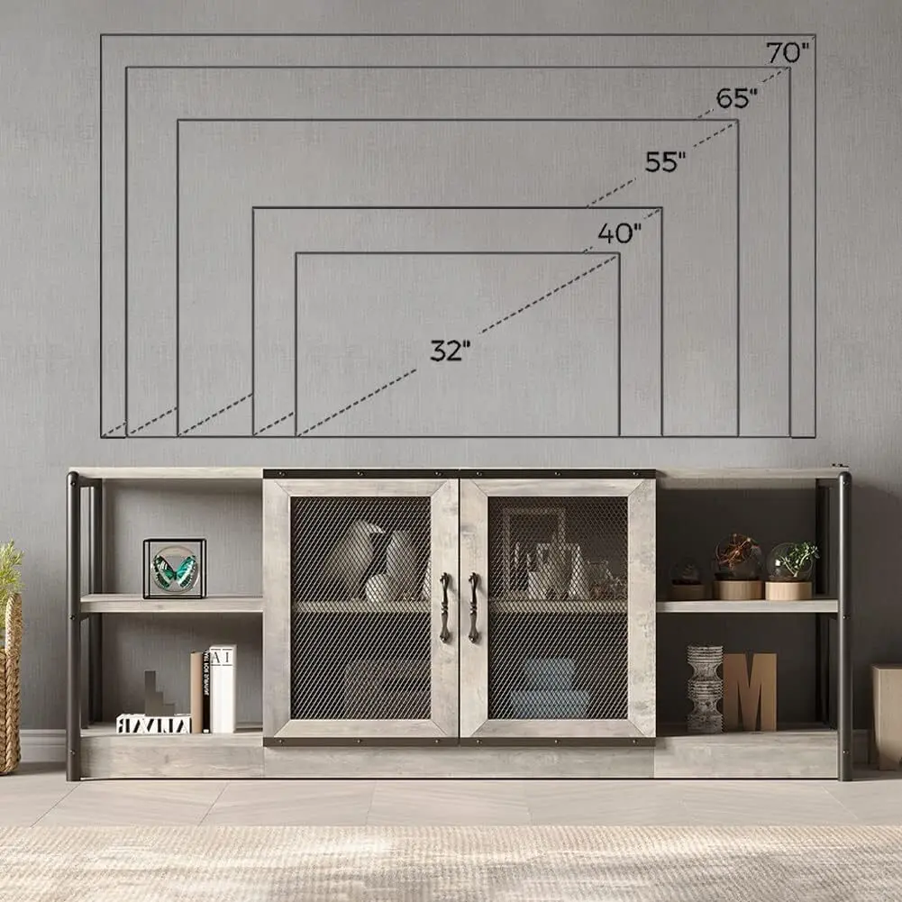 This TV stand features a distinctive industrial design with metal accents and a rustic wood finish, making it perfect for farmhouse, living room, or bedroom decor. Measuring 63" L x 18.3" W x 25" H, it accommodates flat-screen and curved TVs up to 70 inches, providing ample surface area and storage for your media essentials. Crafted from high-density MDF and sturdy metal, it supports up to 500 lbs on the tabletop and 30 lbs per shelf. The mesh door design allows you to showcase your items while cable management holes keep everything organized. Additionally, the generous 10-inch spacing between shelves accommodates larger items with ease.
