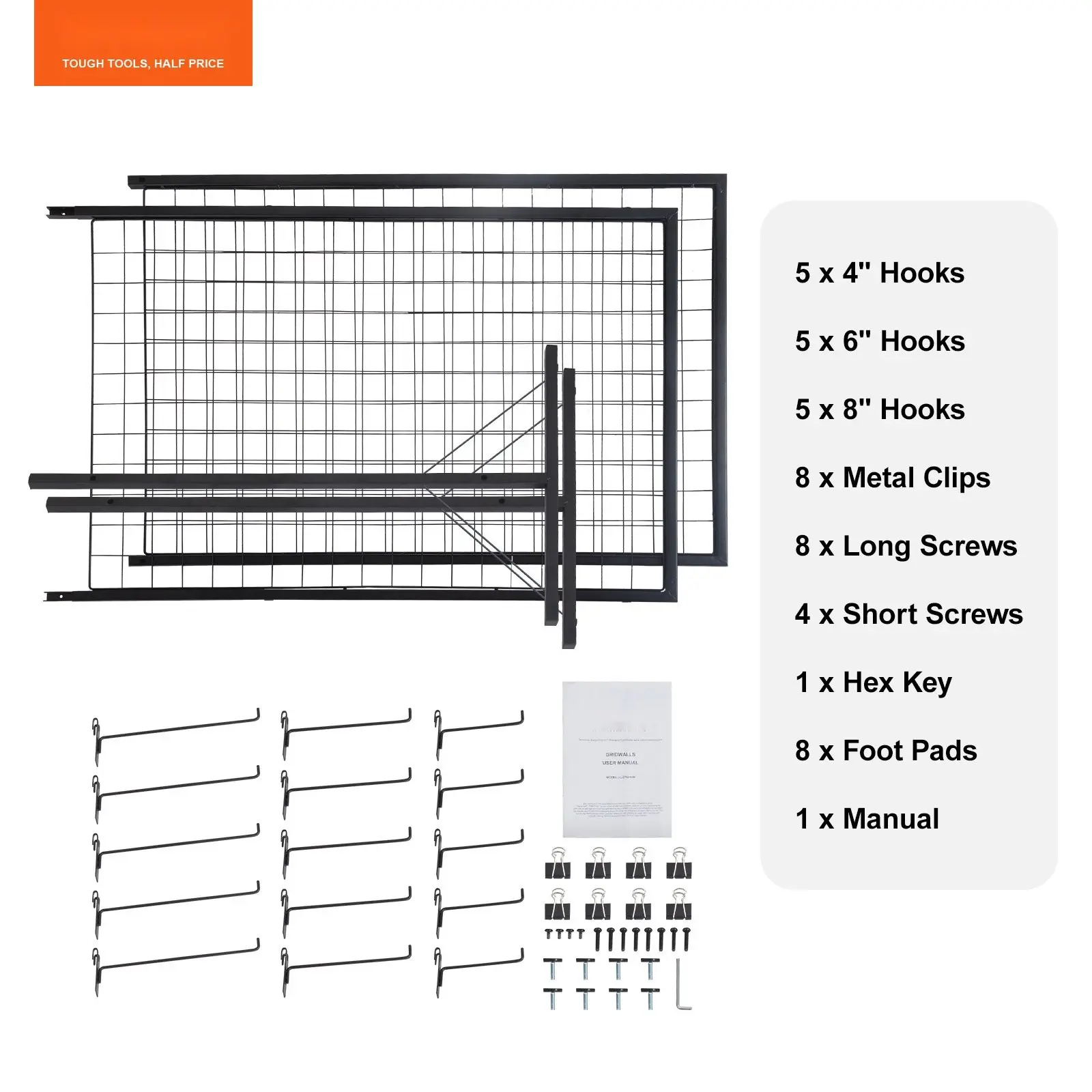 ·Whatâs in the Package: You will receive 2 top meshes, 2 bottom meshes, 4 foot frames, 5 small pot hooks, a spanner, 5 medium pot hooks, 8 leveling feet, 5 large pot hooks, 4 screw type A, 8 screw type B, and 8 clips. Use the hooks to customize your gridwall panel display stand to your liking!