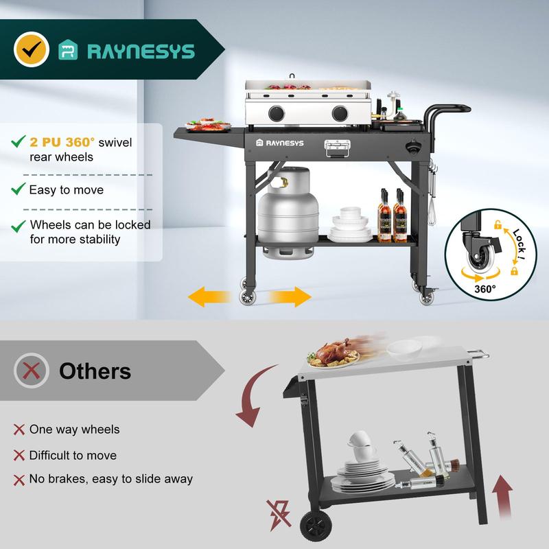 ·Multi-Functional Blackstone Table:The grill table is equipped with 3-inch silent universal wheels and curved handle, which can be easily pushed in any direction, convenient to move and save your effort. It can be used as camping table, barbecue table, cooking table, food pre table outdoors. In addition, it can also be used indoors as a mobile workbench and storage rack. The rear wheels with brakes hold the cart securely for more safety.