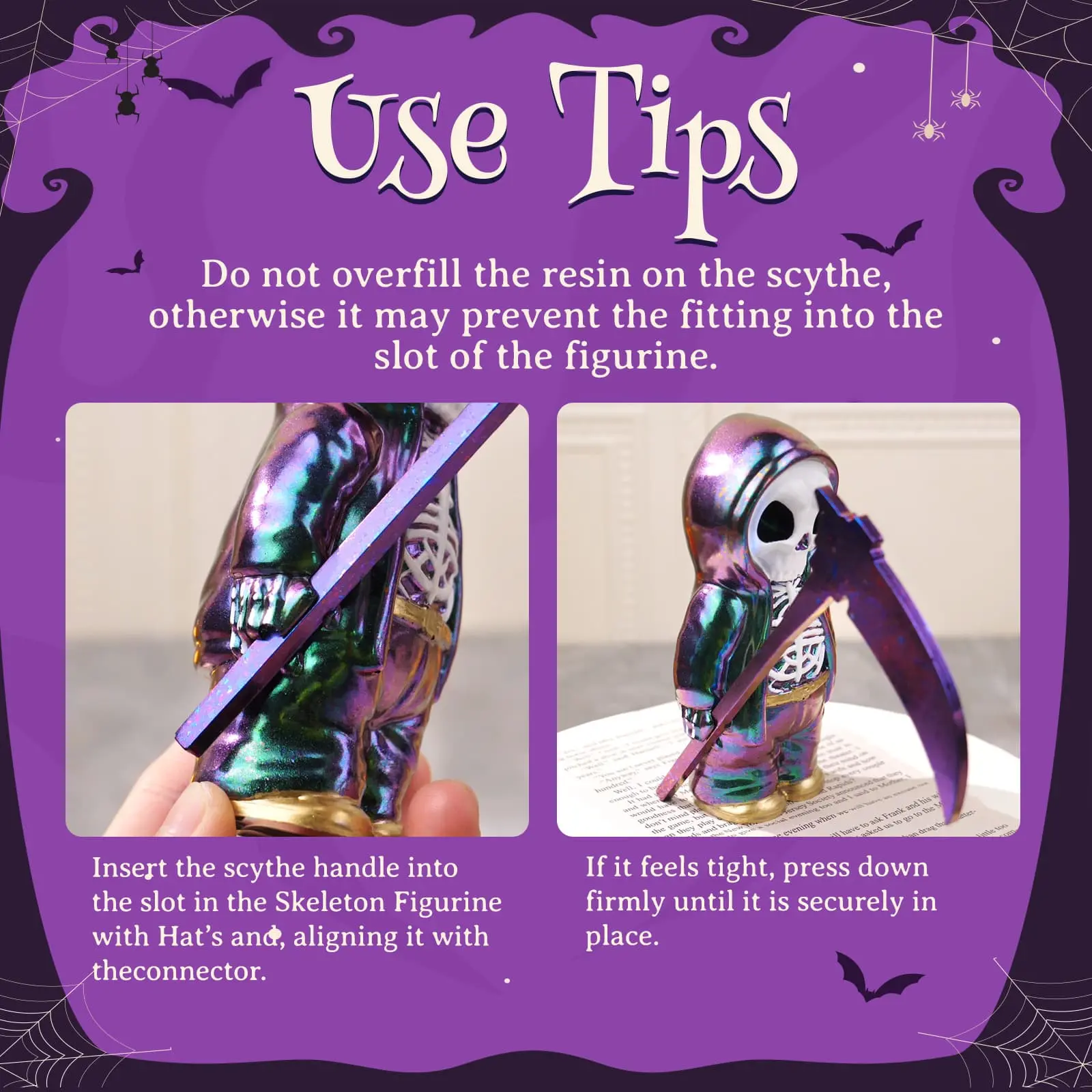·【Use Tips for Better Results】: 1) When pouring resin into the scythe resin mold, avoid overfilling or under-filling to prevent from failing to fix into the slot of the figurine. 2) Never use a flame torch on these silicone molds—it can melt the material.