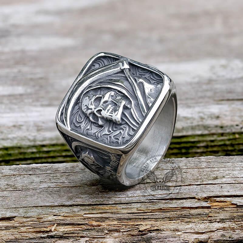 ยทUnisex design: The GTHIC Vintage Grim Reaper Skull Square Ring is suitable for both men and women, making it a versatile accessory for anyone to wear.
