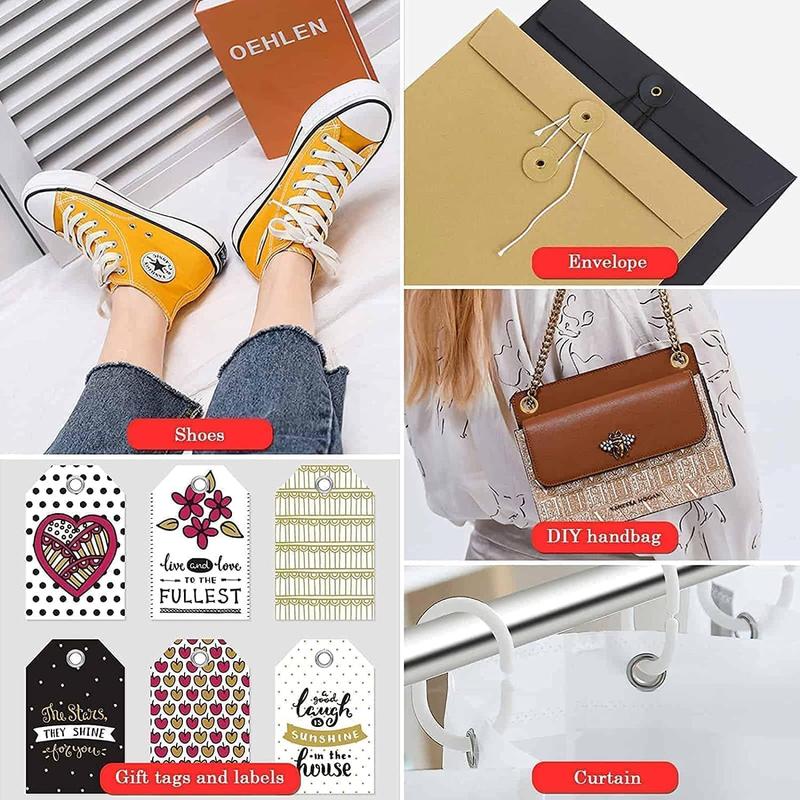 ยทIntended Use - The metal grommets are light duty, more for decoration, canโt hold heavy pulling. This grommets kit is ideal for 1-3 mm thick materials like leather, tarps, shoes, elastic bands, paper cards, and hanging crafts. Not suitable for fabrics or cloth