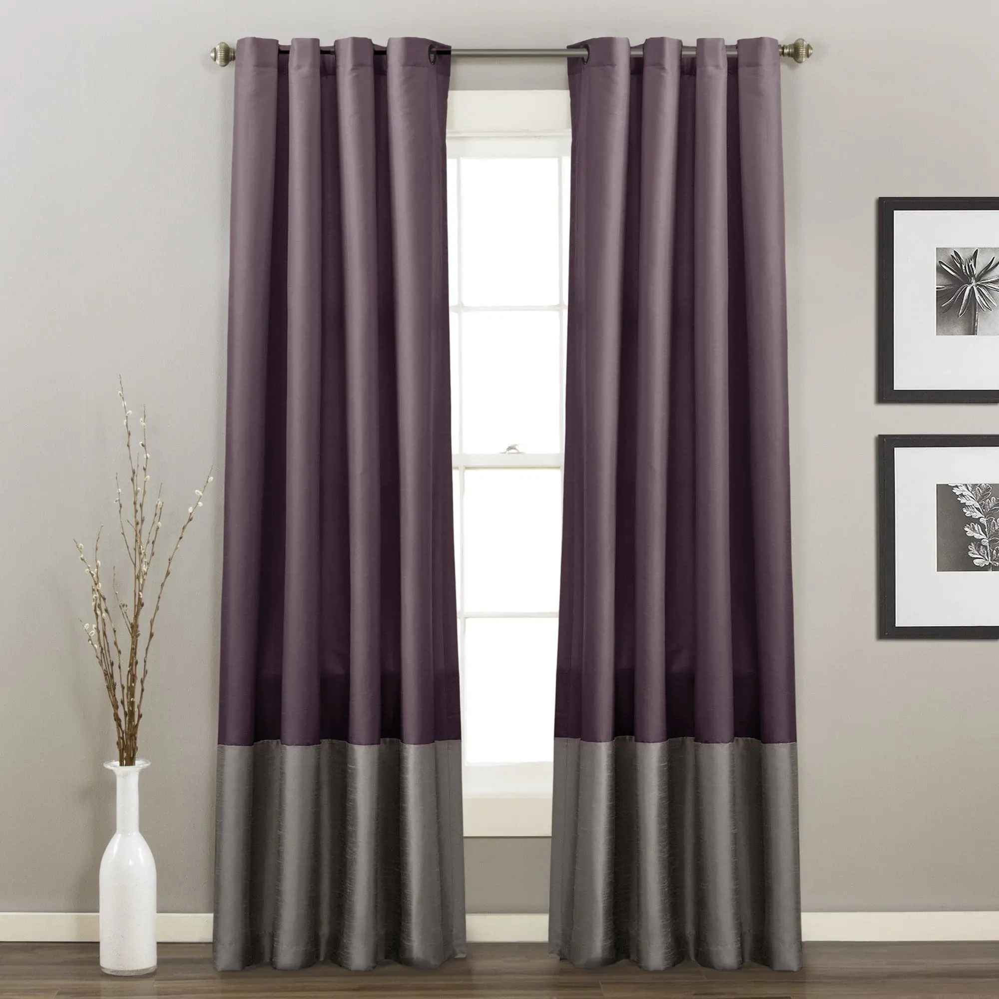 The Prima Grommet Window Curtain Panel Set features a classic block design. The top three-quarters are one color, with a complementary bottom quarter. The full lining provides extra insulation and privacy. Perfect for living rooms, family rooms, dining rooms, bedrooms, or dens. The understated design suits various decor styles. Comes in a set of two panels, measuring 84, 95, or 108 inches long and 54 inches wide.