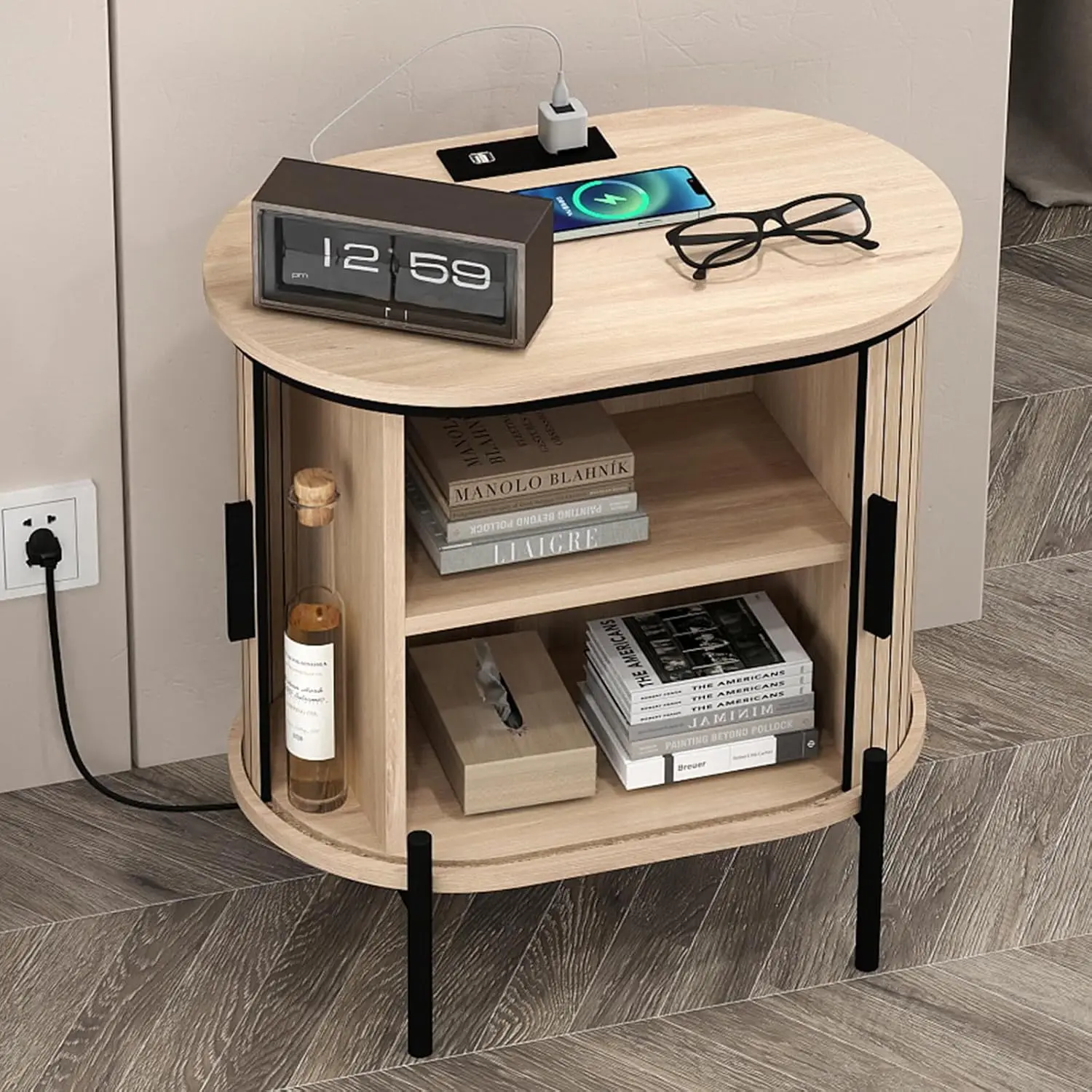 Grooved Nightstand with Ample Storage: Designed with a sliding door and adjustable cabinet shelves, this wooden nightstand with charging station offers flexible storage solutions for all your essentials while keeping your space tidy.