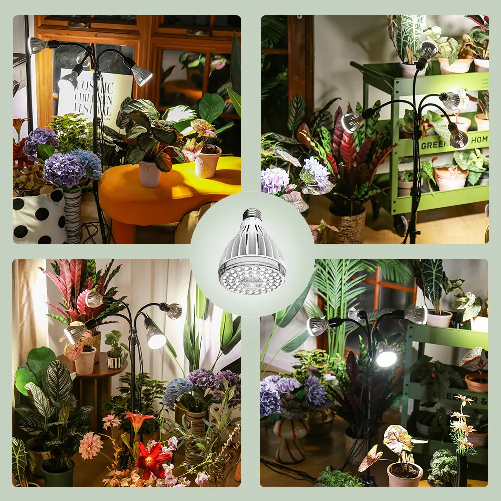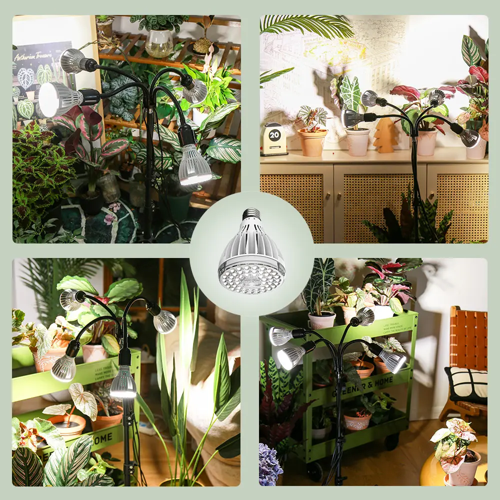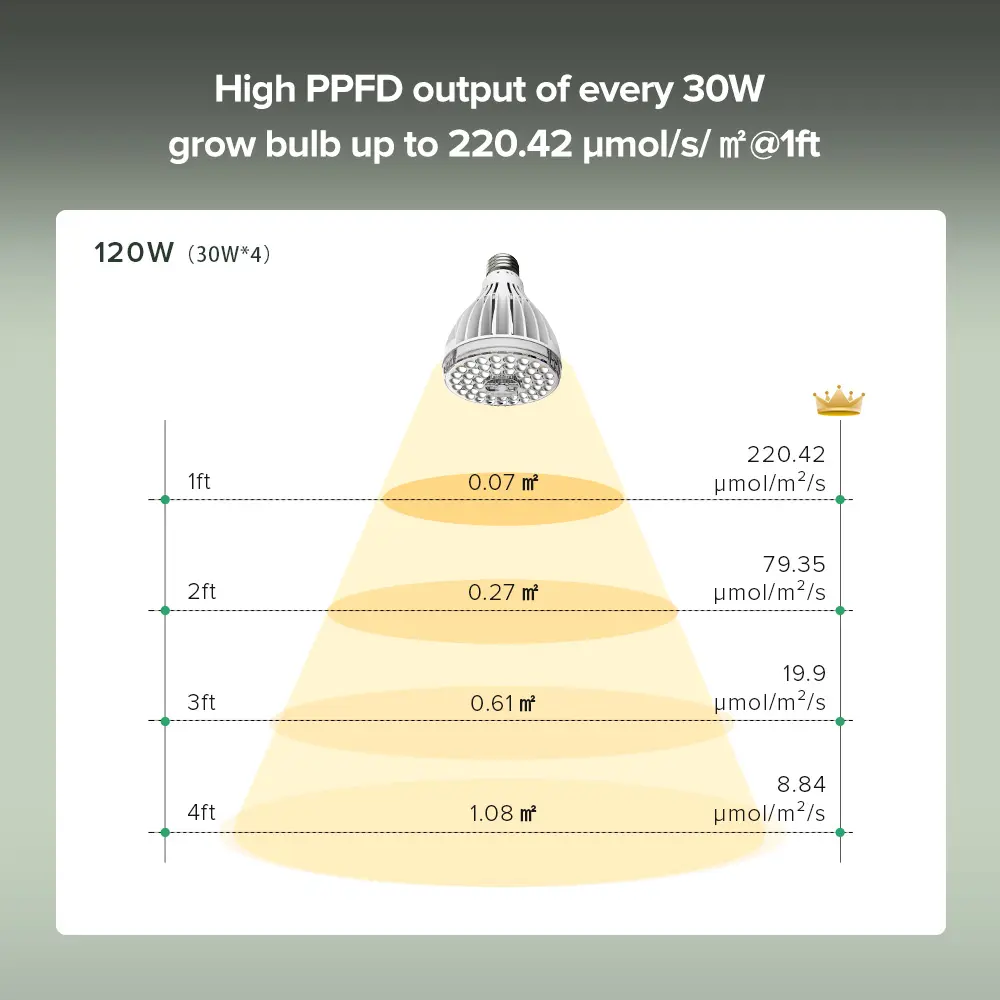 ·HIGH PPFD: The PPFD of every 32W grow light bulb is 380.34μmol/s/㎡@1FT: and the beam angle is 120 degrees, which provides a wider coverage area, ensuring that your plants receive sufficient light from all angles. Gives plants more supplementary light, allowing them to radiate vitality and thrive