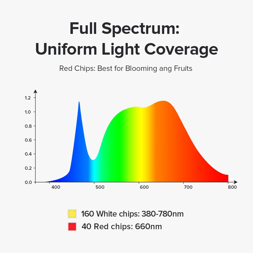 ·FULL SPECTRUM: Imitate the solar spectrum, customize a more ideal full life cycle full spectrum supplementary light program, covering the entire visible spectrum of 400nm-780nm; CRI 90+, infinitely close to natural light, suitable for every cycle of plant growth, effectively promotes plant growth, and improves crop yield and quality