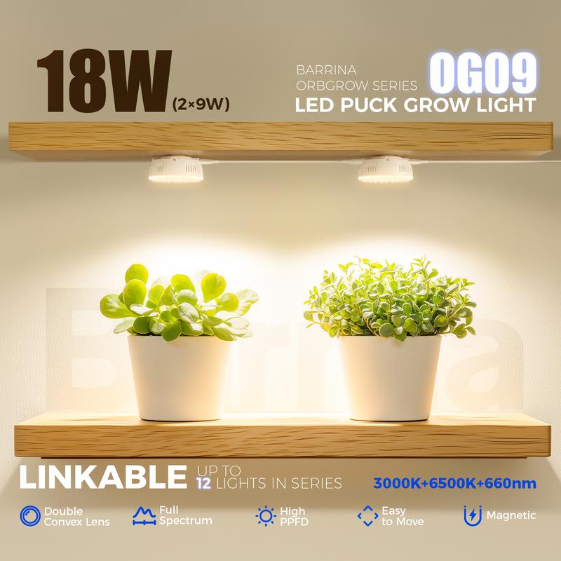 5. Barrina Orbgrow OG09 Puck Grow Light with Timer, 660nm Red LEDs 18W(2 x 9W, 270 Watt Equiv), Full Spectrum Plant Light for Indoor Plant, Magnetic & Linkable, 5 Levels Dimmable for Plant Shelf, 2 Packs