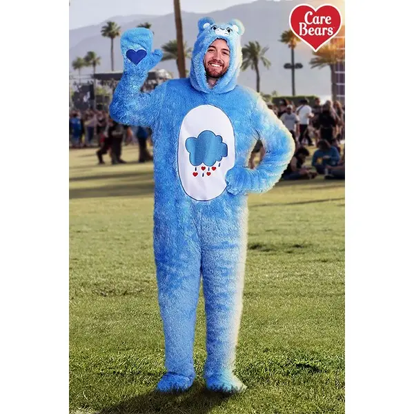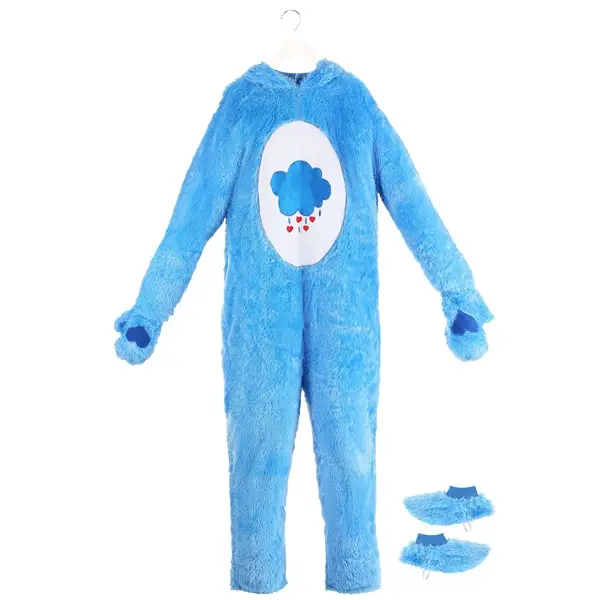 This exclusively licensed Care Bear jumpsuit is uber cozy. It has a fuzzy textured surface that covers the mittens, shoe covers, and hood. The hood has a thoughtful Grump Bear face and ears that can act as a mask. The mittens cover your hands with a heart on the palms. The large white patch on the belly with the rainy day icon in the middle. And of course, the look is finished off with a little Care Bear heart and tail on the rear to make you look like a Care Bear straight from the eighties