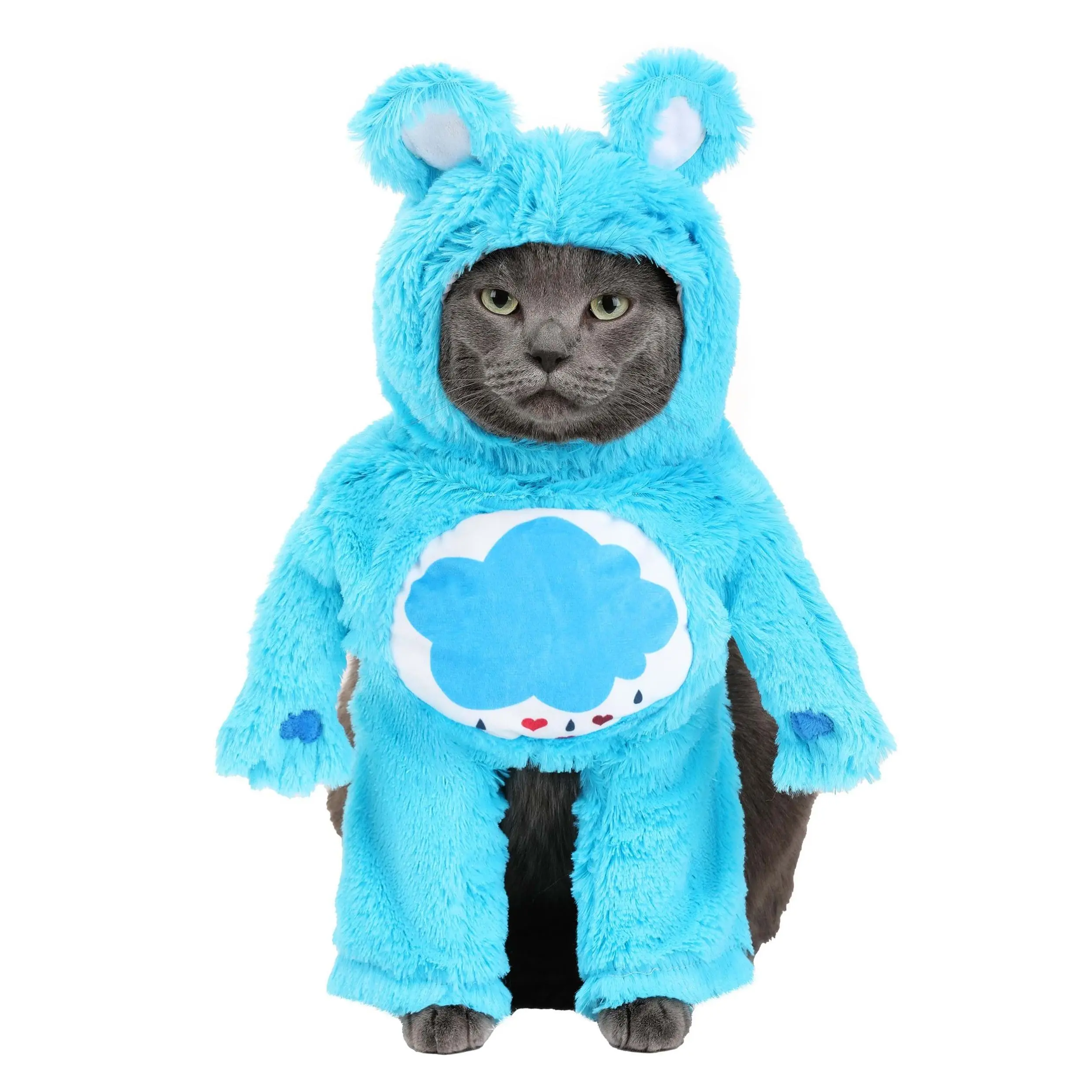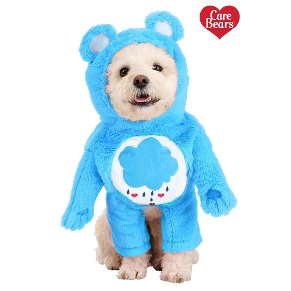 This one-piece costume, made from fluffy blue fabric, slips on over your dog’s front legs and secures behind their head with a hook and loop fastener. Bear ears on top of the hood and attached arms complete with heart-shaped paw pads, make your pup look just like this classic Care Bear. A white fleece belly badge with Grumpy Bear’s printed signature raincloud completes the outfit. Your dog will be the cutest canine around in this delightful costume!