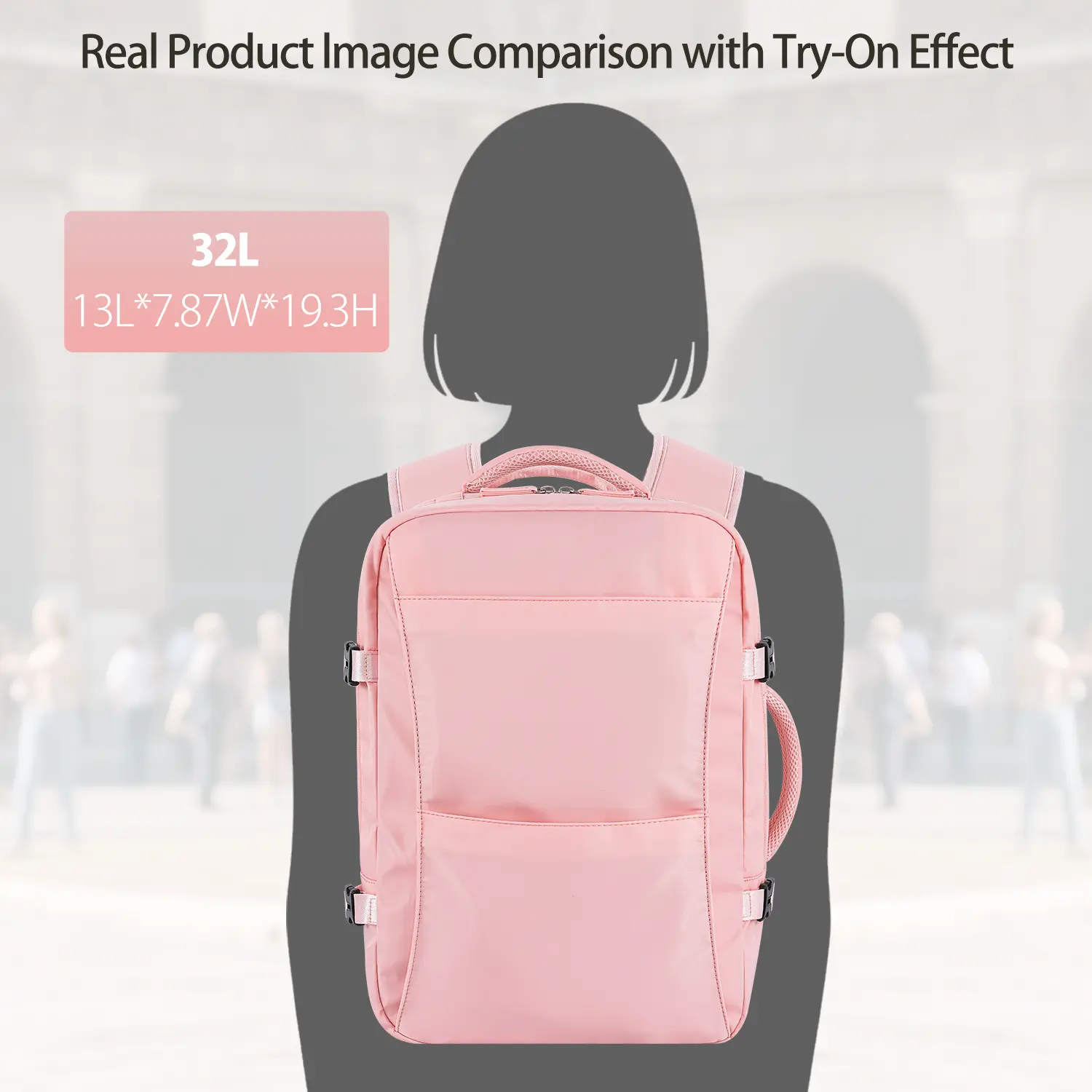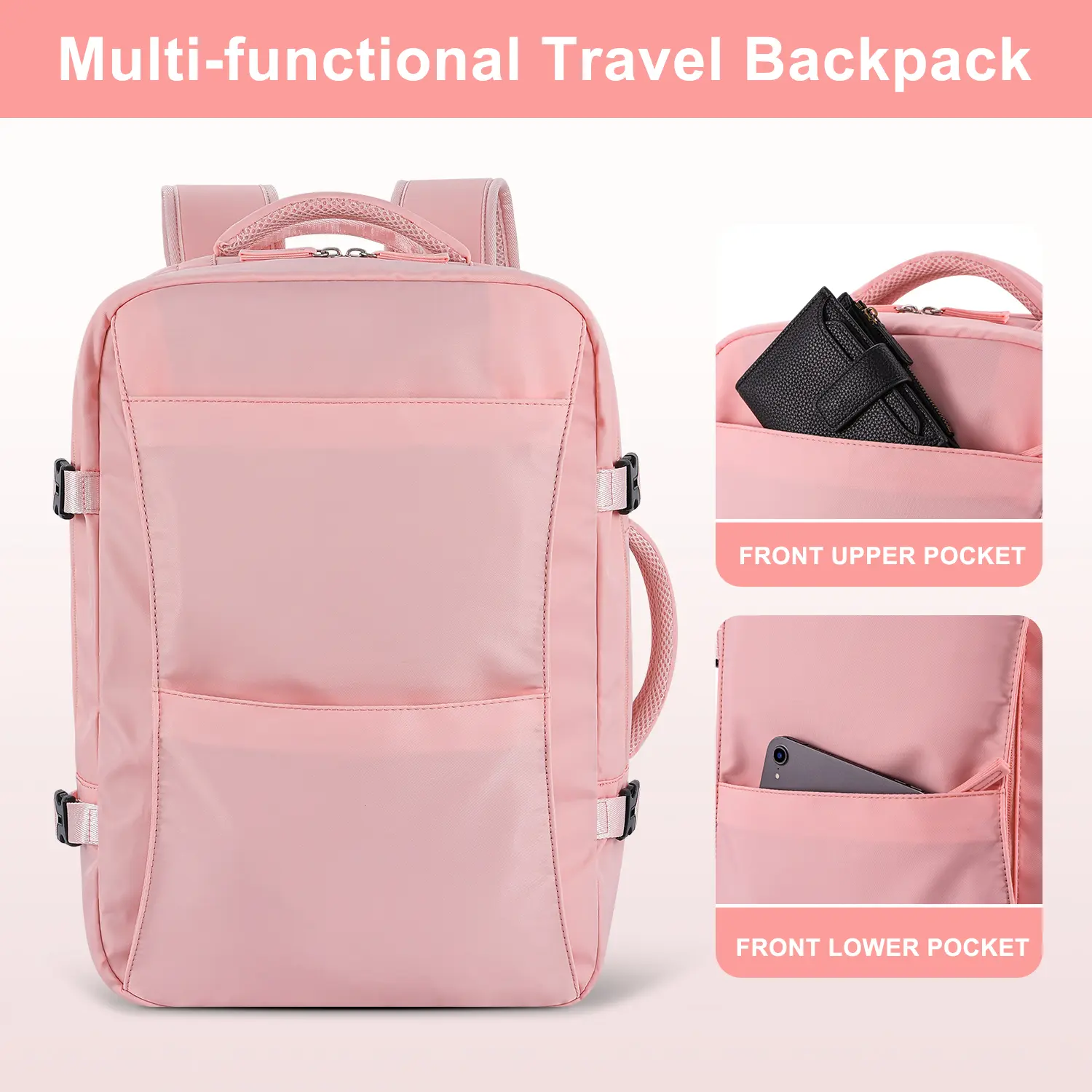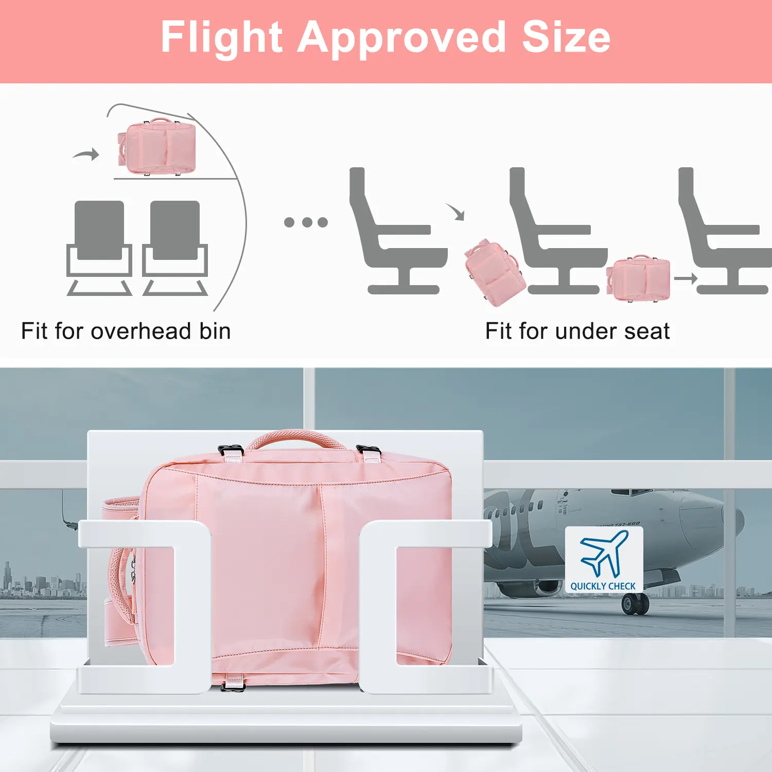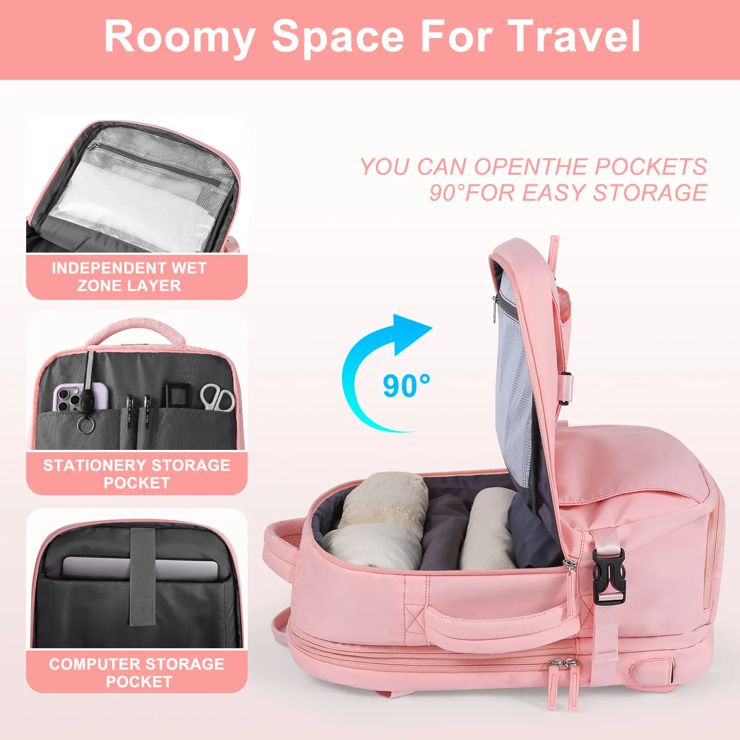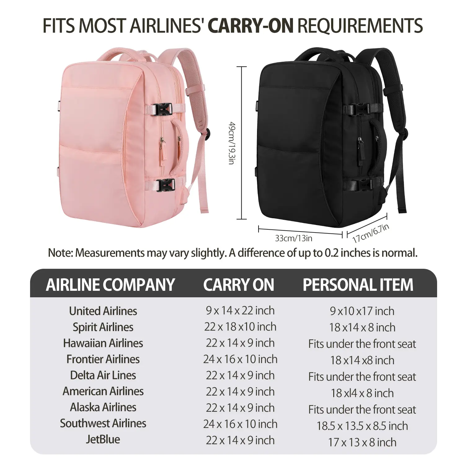 The backpack measures 19.3 × 13 × 6.7 inches externally and weighs approximately 2 pounds (manual measurement, actual size may vary slightly). It meets most airlines' carry-on requirements. The 90° full-open design makes it easy to access your items and pass through airport security quickly, making it ideal for air travel.