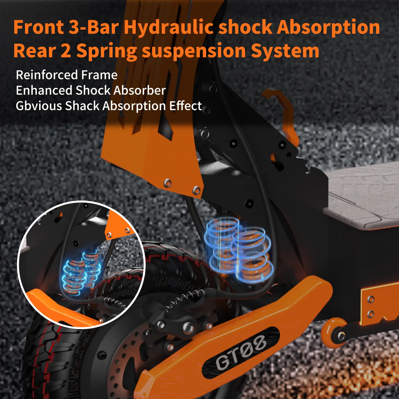 Front and Rear Shock Absorption: Front Dual Spring Shock Absorption (Orange), Rear Hydraulic Shock Absorption (Black)