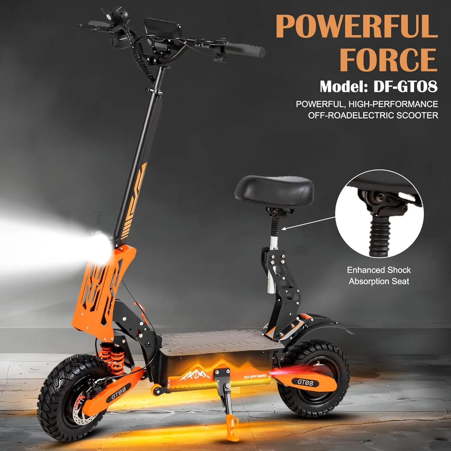 ·【SAFE AND STABLE ADULT SCOOTER WITH HEIGHT ADJUSTABLE SEAT】:The electric scooter is equipped with 11” off-road vacuum tires and dual absorbers to ensure excellent riding performance, easily over speed bumps and efficiently travel from city streets to dirt trails.