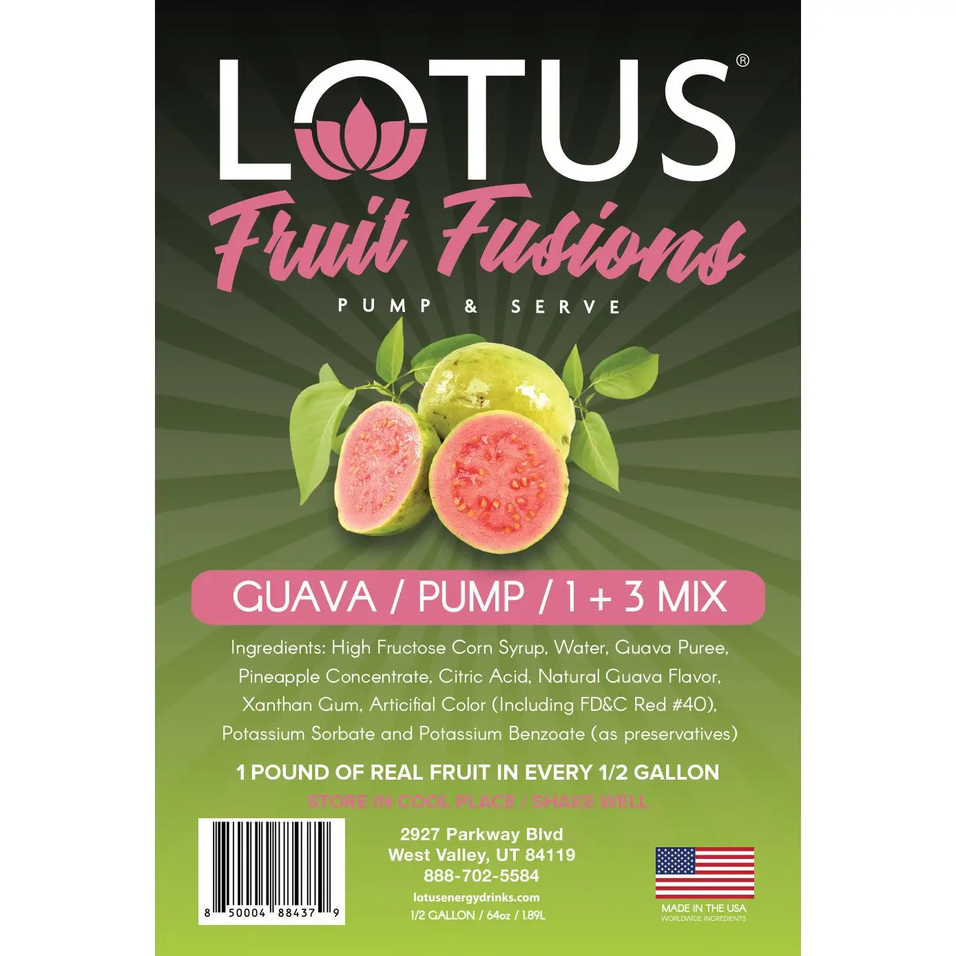 Guava Lotus Fruit Fusion contains 1 pound of real fruit in every 1/2 gallon. Our dual purpose fruit bases are shelf stable made with real fruit that can be added to Flavored Energy Drinks, Fruit Smoothies, Lemonade and Tea. Lotus Fruit Fusion can be enjoyed alone, used to create spectacular smoothies, or energized with our Lotus Energy Concentrate.