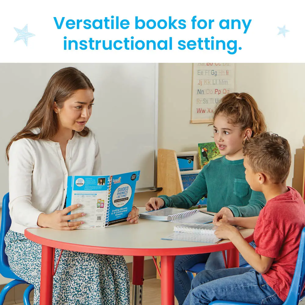 Developed by Tara West, Guided Phonics + Beyond Decodable Books are designed to uniquely engage students in reading while practicing phonics skills. These books are organized to prompt students to apply their phonics knowledge and read before seeing the accompanying pictures, ensuring that guessing and cueing do not occur. The pictures then assist in comprehension after the text has been read. Each Decodable Book includes 10 fiction and 10 nonfiction stories. No irregular high-frequency words appear in the stories until they are explicitly taught in Guided Phonics + Beyond Focus Lessons.