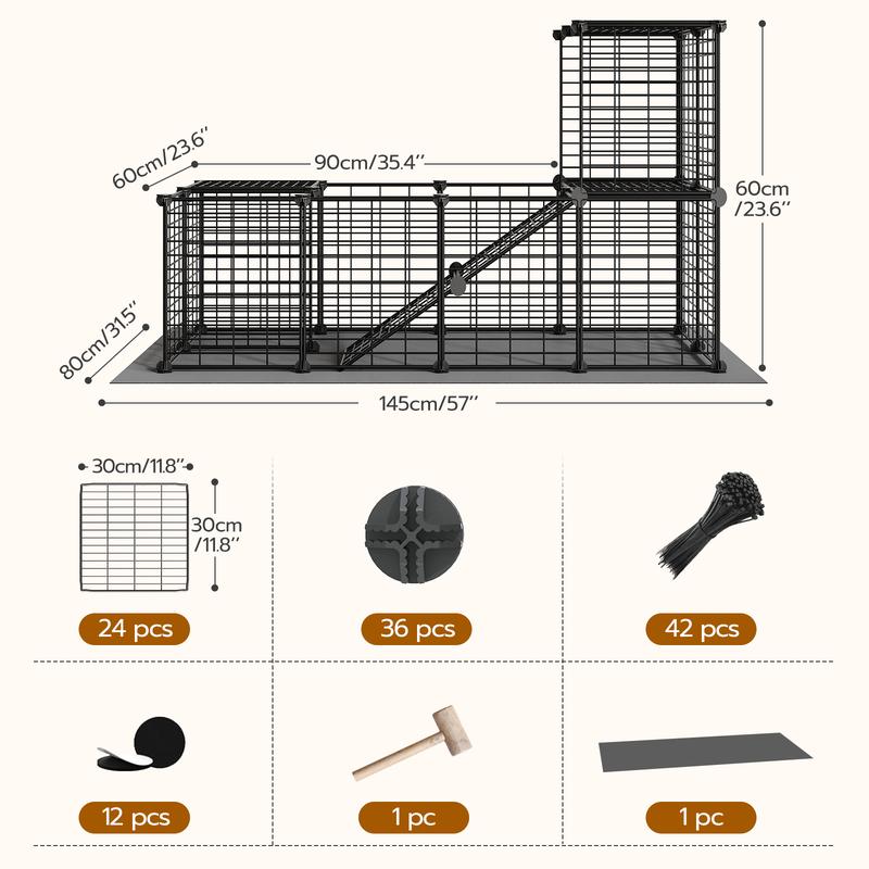 The dimensions of the guinea pig cage are 57 x 23.6 x 31.5 inches, composed of 24 (11.8"L x 11.8"W) mesh panels, offers ample space for various zones such as feeding, resting, exploring, and toileting areas