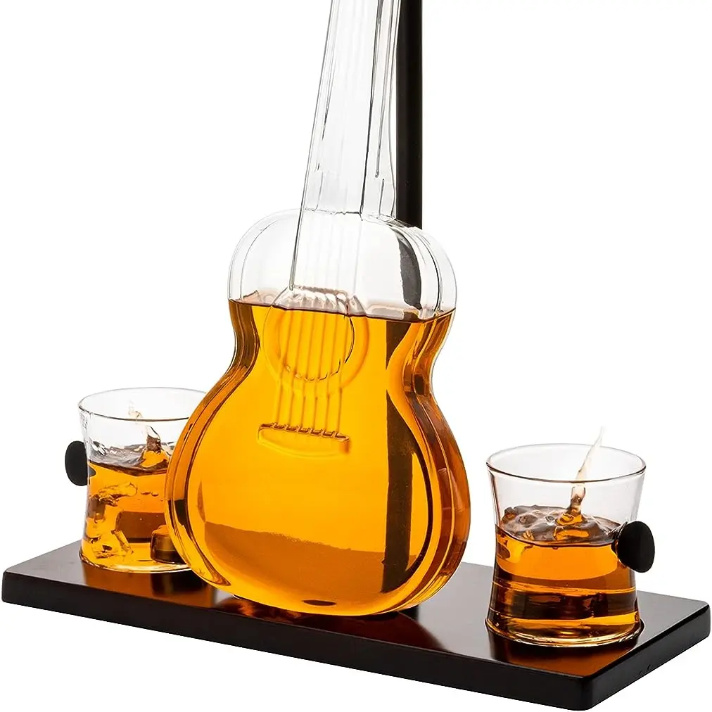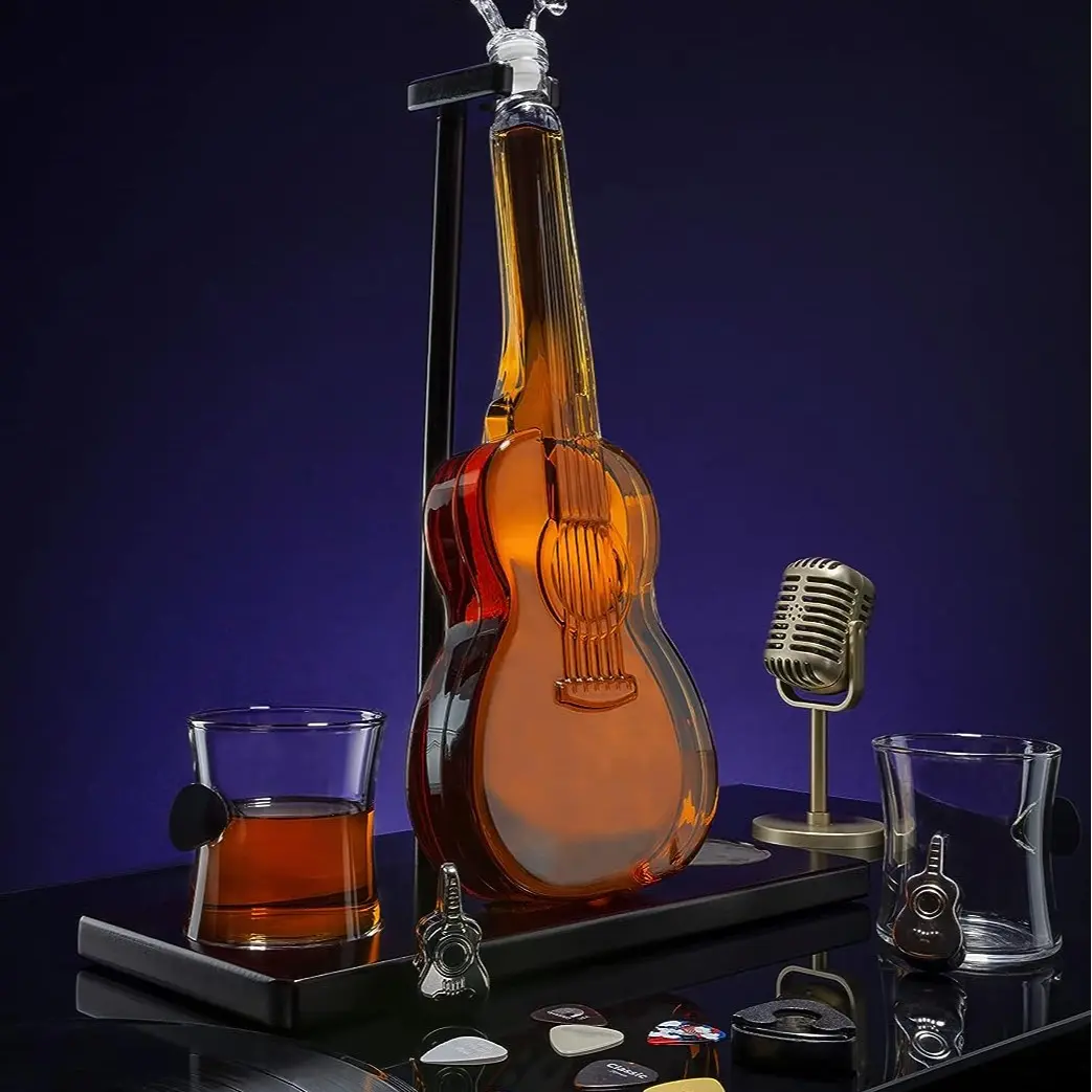 ·Add some class to your collection with this attractive and unique Whiskey decanter. Receive compliments and Rock On while enjoying a fine dram of whiskey. This decanter is made of high quality borosilicate with a shiny black base, the top opens simply by turning the guitar handle to pour. Pour your favorite whiskey, scotch, bourbon or spirits into the beautiful guitar glasses adorned with guitar pick handles and compliment your bar while you add a little extra elegance to your jam sessions.