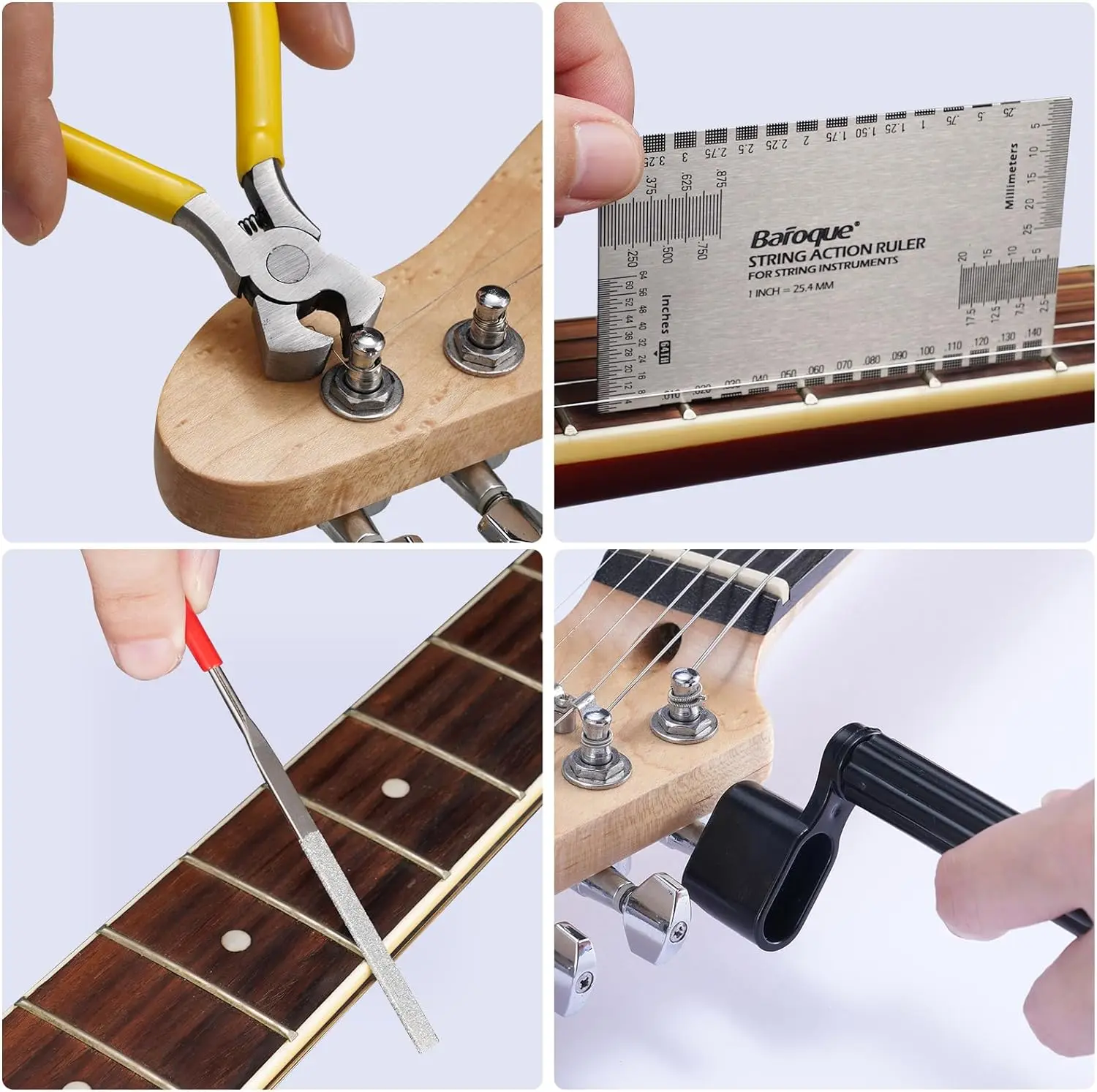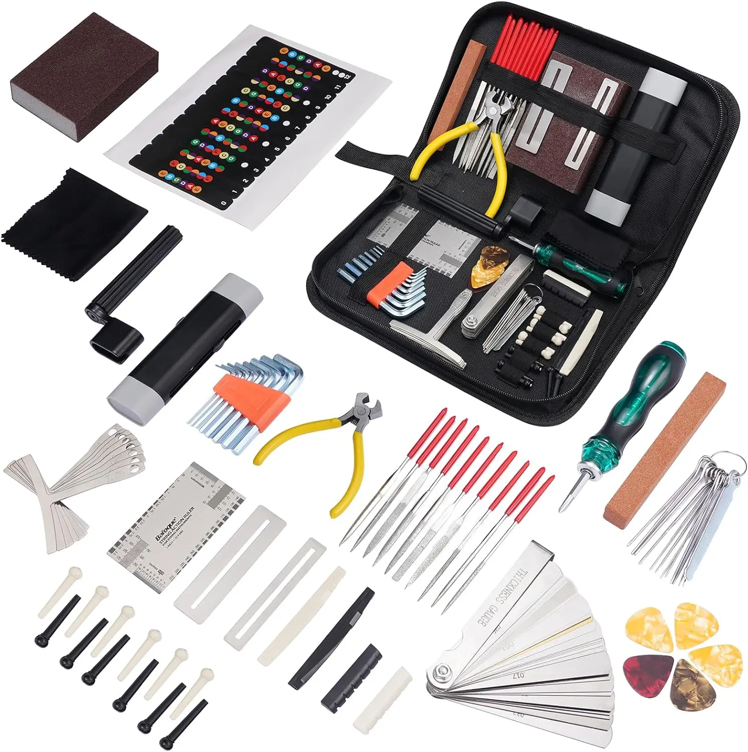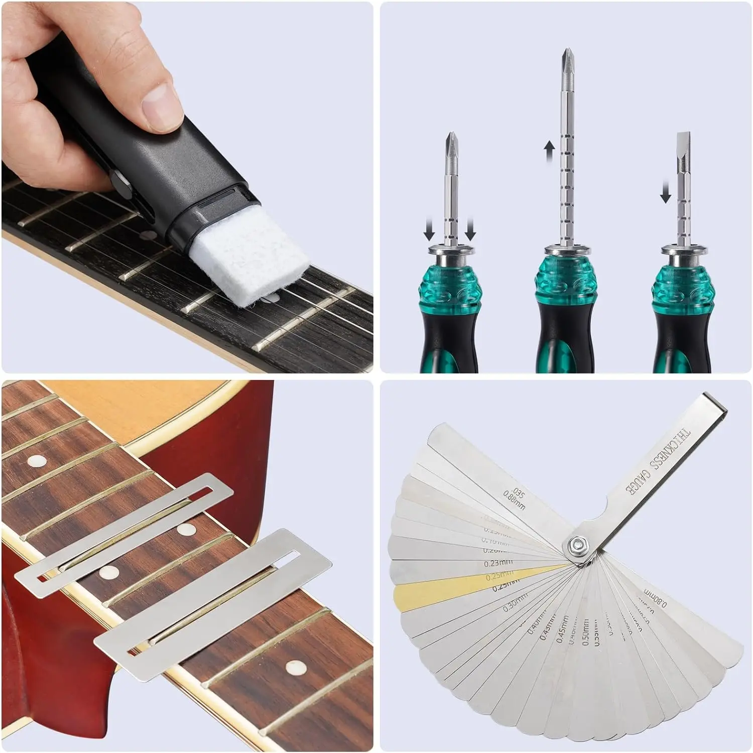 72Pcs guitar tool kit includes Strings Cleaner Eraser, String Winder, Hex Wrenches, String Action Ruler, Screwdriver, String Pliers, Fretboard Guard, Fretboard Sticker Feeler Gauge, and so on