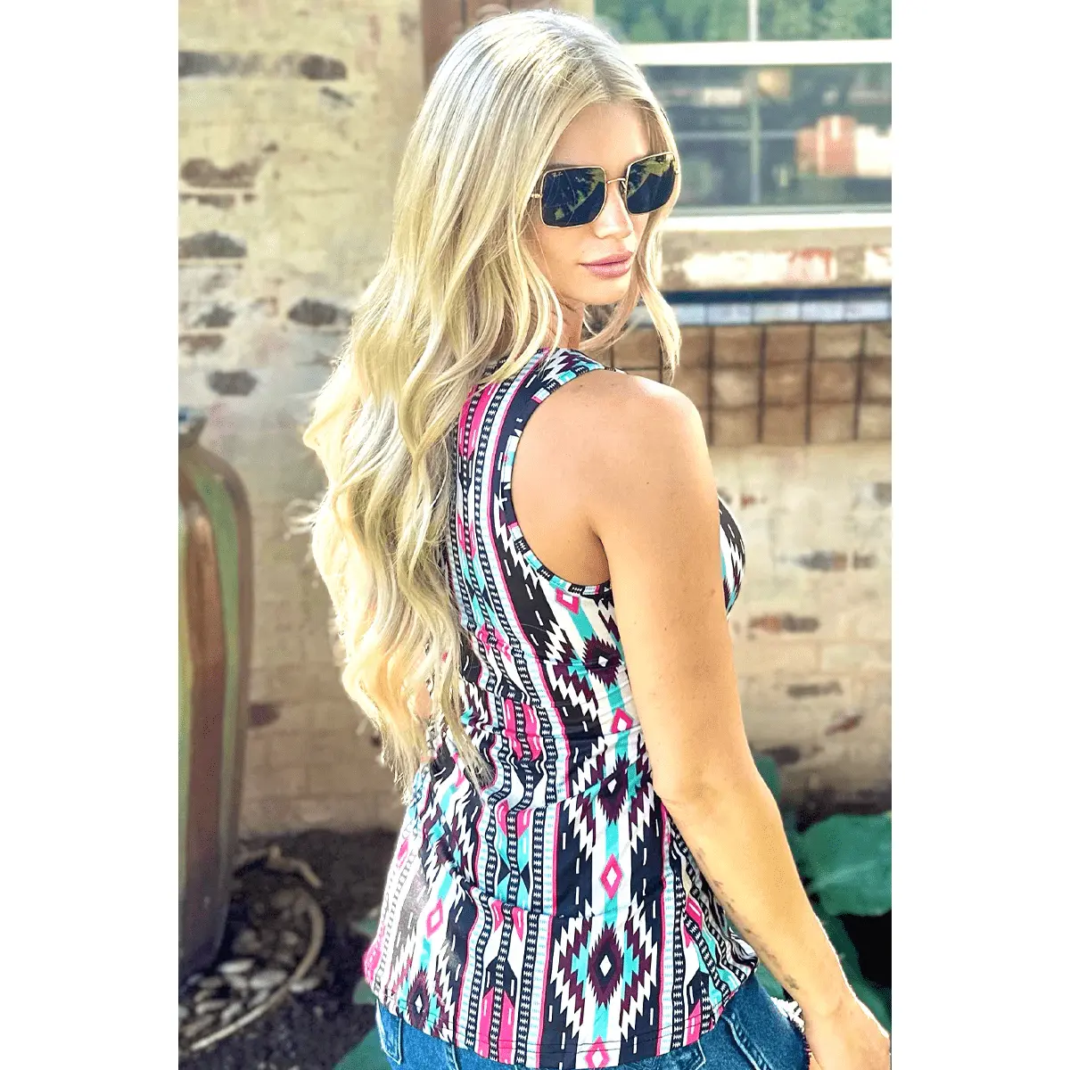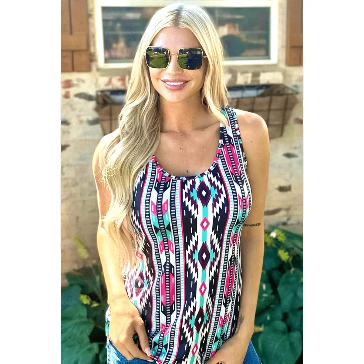 Be the life of the party with our Gulf Coast Tank! This stylish top features a charming black, tan, pink, and turquoise Aztec print. Whether you're beachin' it up or going on a summer night out, this tank will have you lookin' sassy and fun! #Mesmerizing🤩