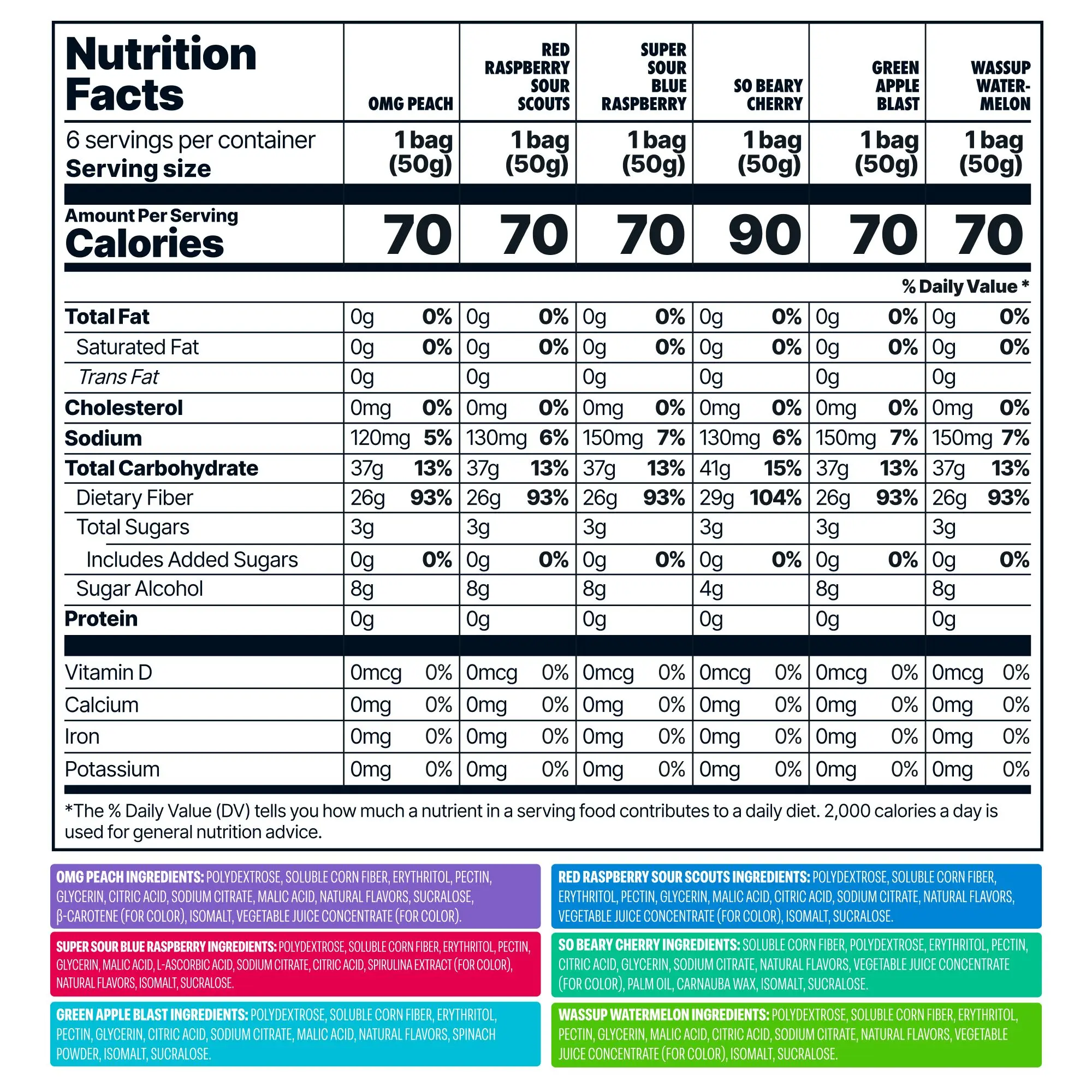 These are great alternative to gummy candy even though you can tell they’re not full sugar. They still satisfy the craving. I like that it has a daily amount of fiber. The company was great to work with. My one box came damaged and replaced it quickly.