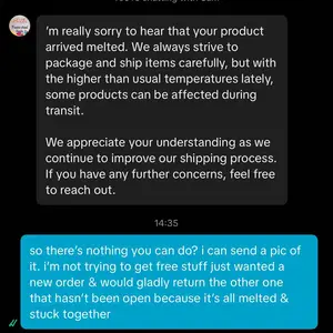 i tried to talk to someone & stated the candy was melted (not their fault i know. i live in az & it’s hot outside) i did get the package right when i got the notification it was here. when i opened it, it was melted. i messaged them & they basically just said the temp outside but didn’t offer to make it better. i stated it’s unopened & would send a pic & would gladly send it back because im not trying to get free stuff. i would return it back just to get a new one to exchange but instead they open my message & not reply. would have been a returning customer if this experience was better.