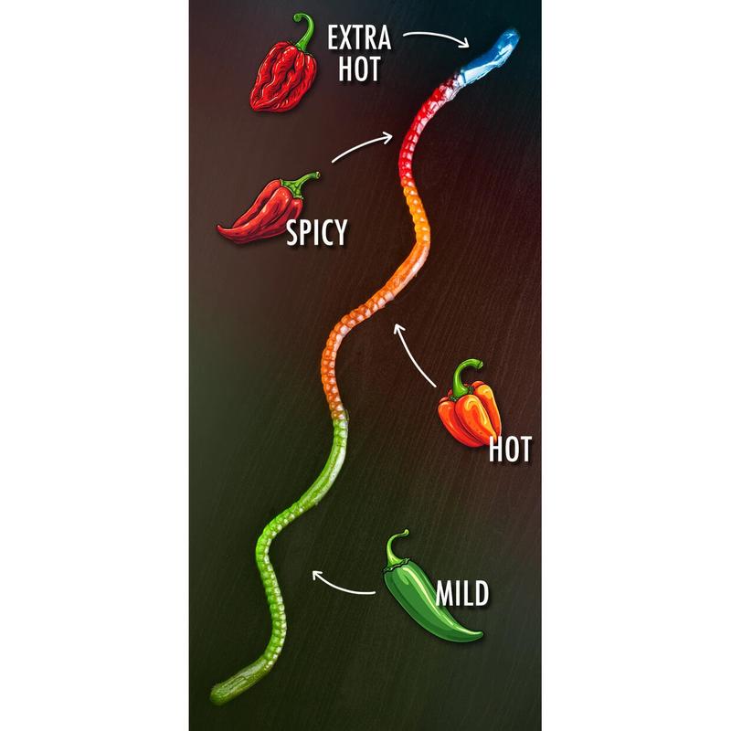 Whoever said gummy couldn't hurt you has obviously never taken The Spicy Gummy Fireworm challenge! This twenty-four-inch long, quadruple-segmented gummy packs an ever-increasing dose of flavorful spice with every bite along the way. Each segment of this formidable gummy grub is flavored with delicious fruit flavor and paired with a spice level that makes each bite hotter than the last. We highly recommend beginning with green apple jalapeño and working your way toward blue raspberry Carolina Reaper, but no matter where you start, this stellar creepy crawly will treat your taste buds to a whirlwind of mouth-watering flavor. Do you think you have what it takes to eat the worm?