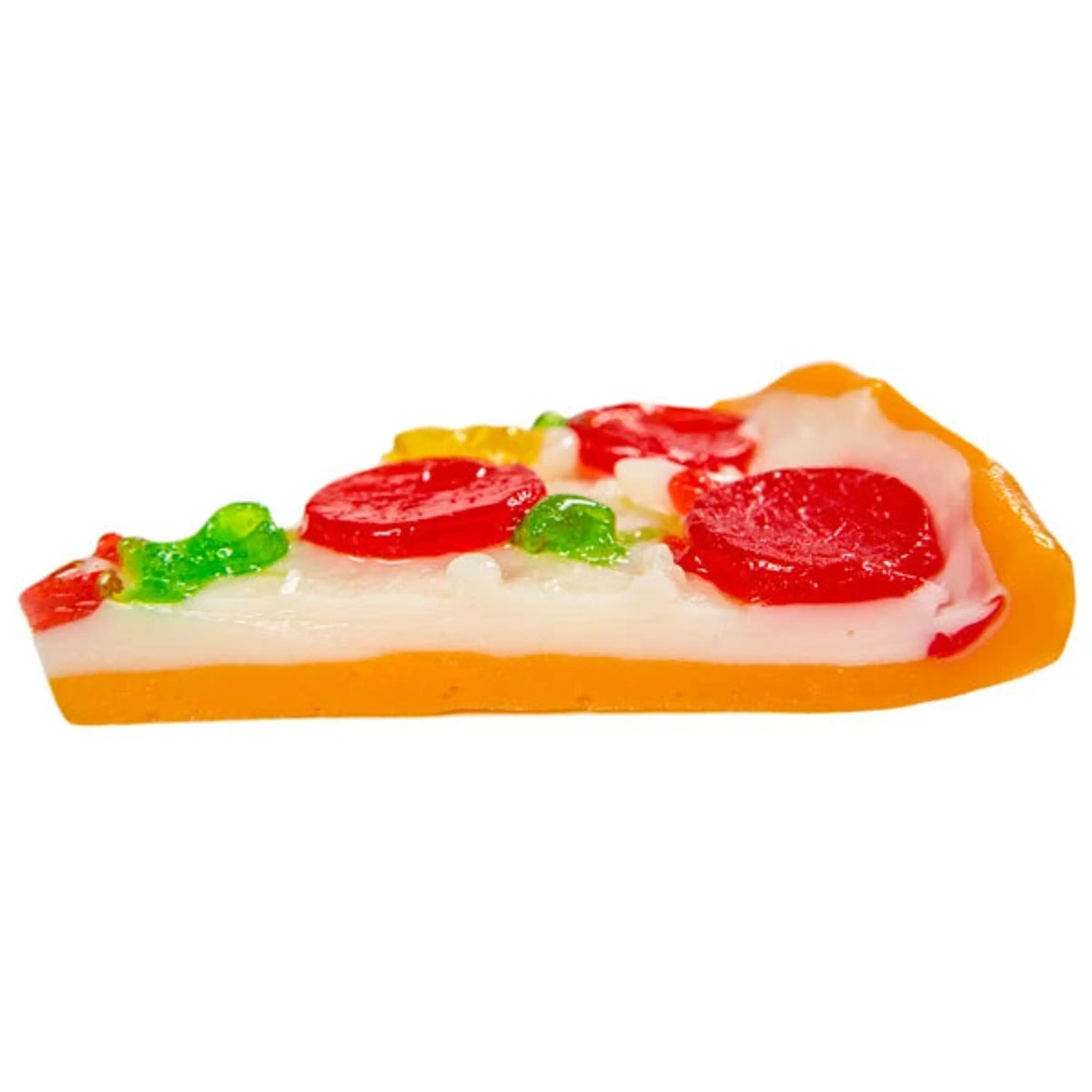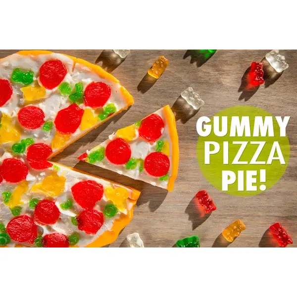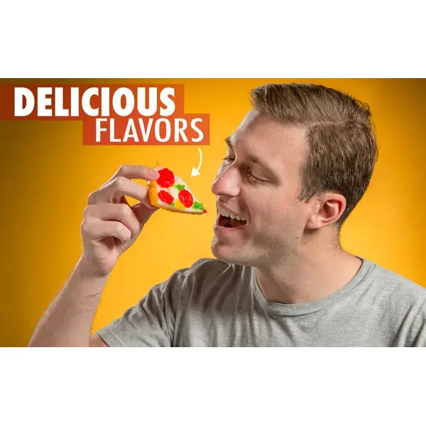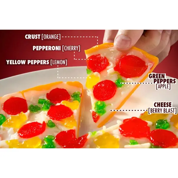 Grab a slice of sugary perfection with Gummy Pizza, an eight-inch gummy pizza that looks like the real thing. Every ingredient that makes up this sweet pie is a unique gummy flavor, starting with the crust (orange) and cheese (strawberry-banana) all the way to the toppings: pepperoni (cherry), green peppers (apple), and yellow peppers (citrus). Now, who’s going to be the one that gets the last slice? Speaking of slices, Gummy Pizza in a Box is also available as an equally awesome and nearly equally sized individual Pizza Slice (for when you've got the craving for a gummy pie and you want that wedge). For those who prefer a spicy pizza, try pairing it with Spicy Gummy Peppers. Please Note: The Jumbo Slice (14 oz) is nearly the same size as the Full Pie (16 oz).