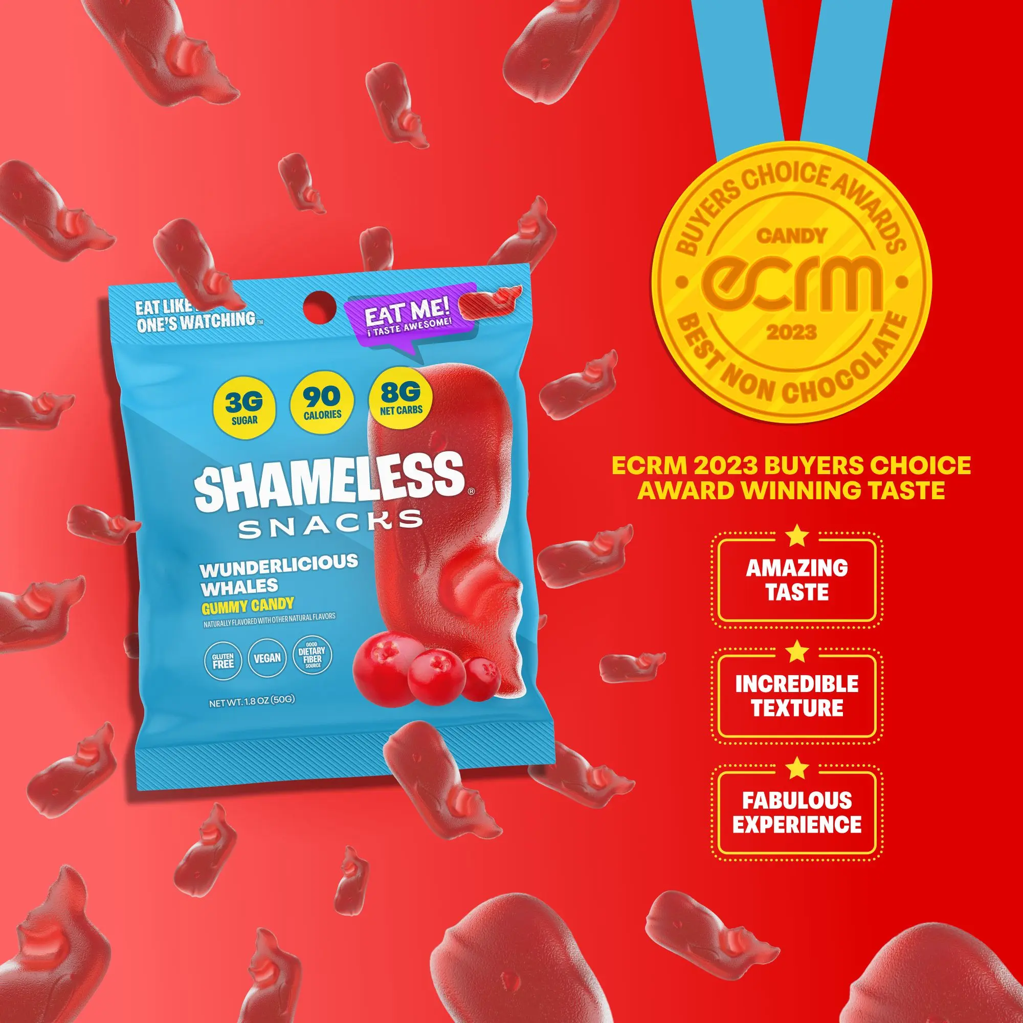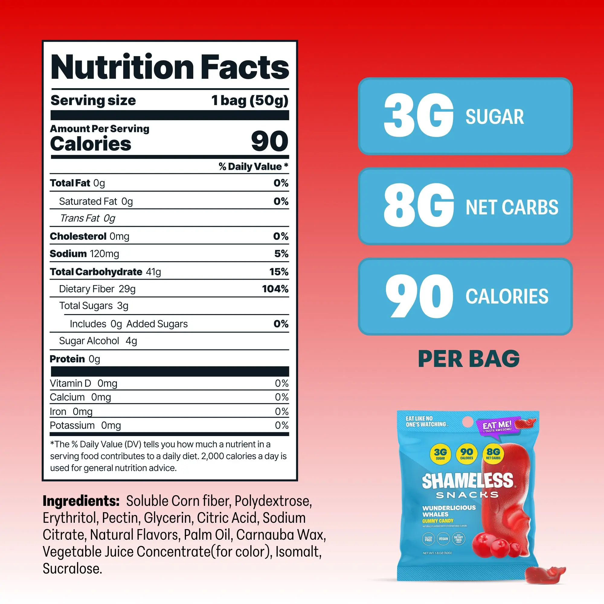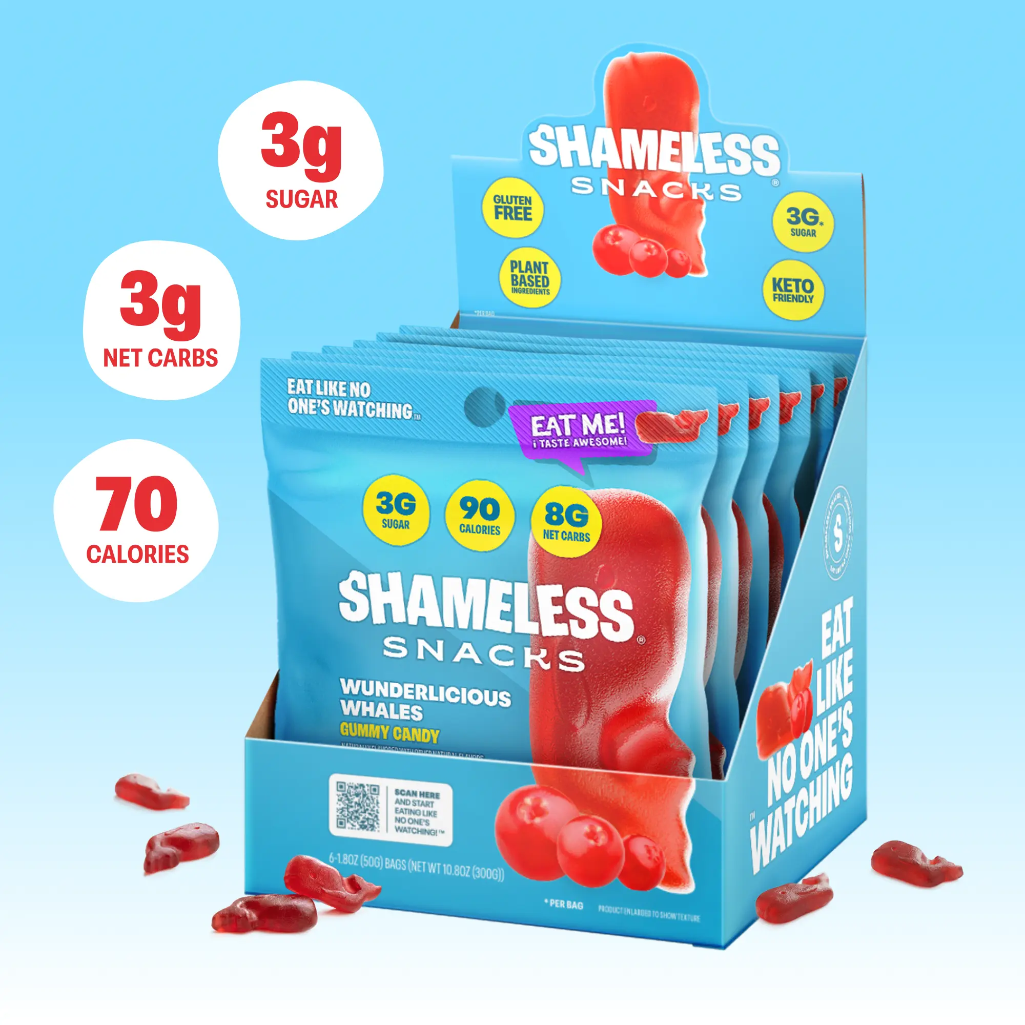 Inspired by the classics but with way less sugar, carbs, and calories — Wunderlicous Whales are a guilt-free gummy candy indulgence. (6 Bags Per Box)