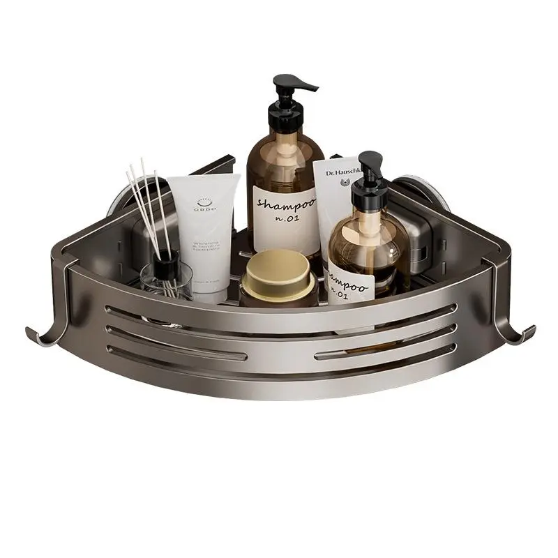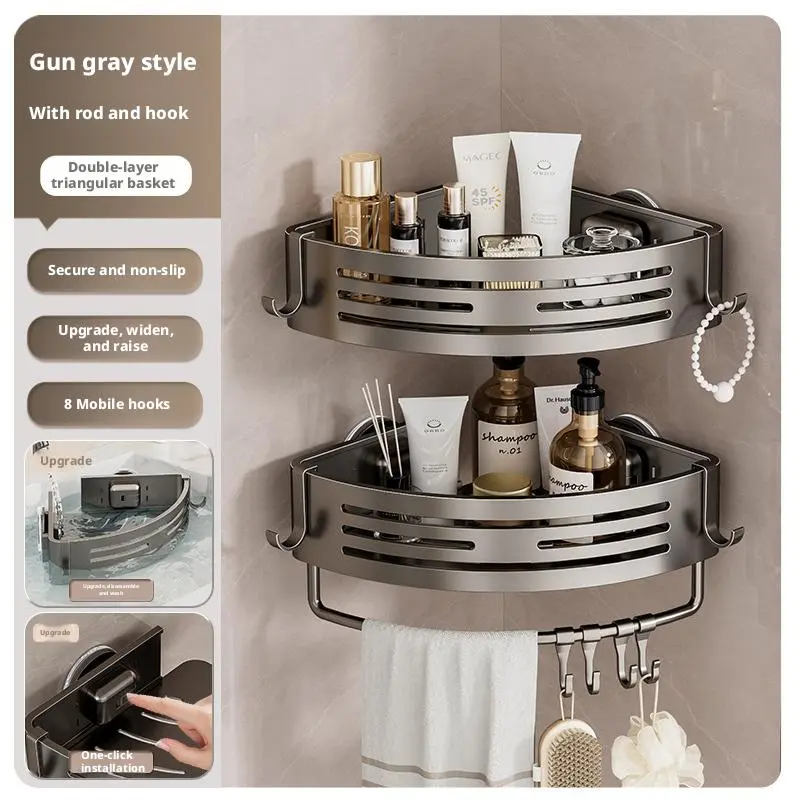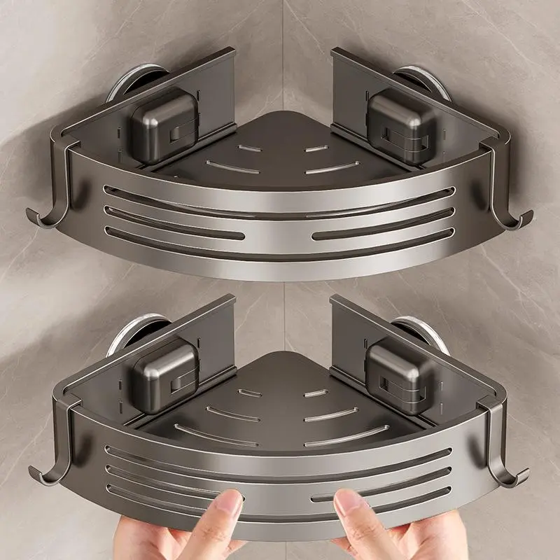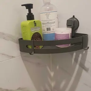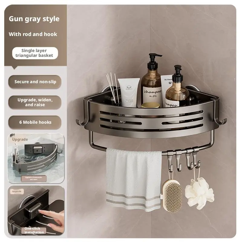 The Gun Gray Aluminum Triangular Suction Cup Shower Caddy is a single-layer corner shelf. It features a no-drilling design, making it easy to install. The caddy has a 40lbs load capacity, perfect for storing towels and toiletries. It includes a hook for additional storage. Ideal for bathroom organization, this caddy offers practical storage solutions.