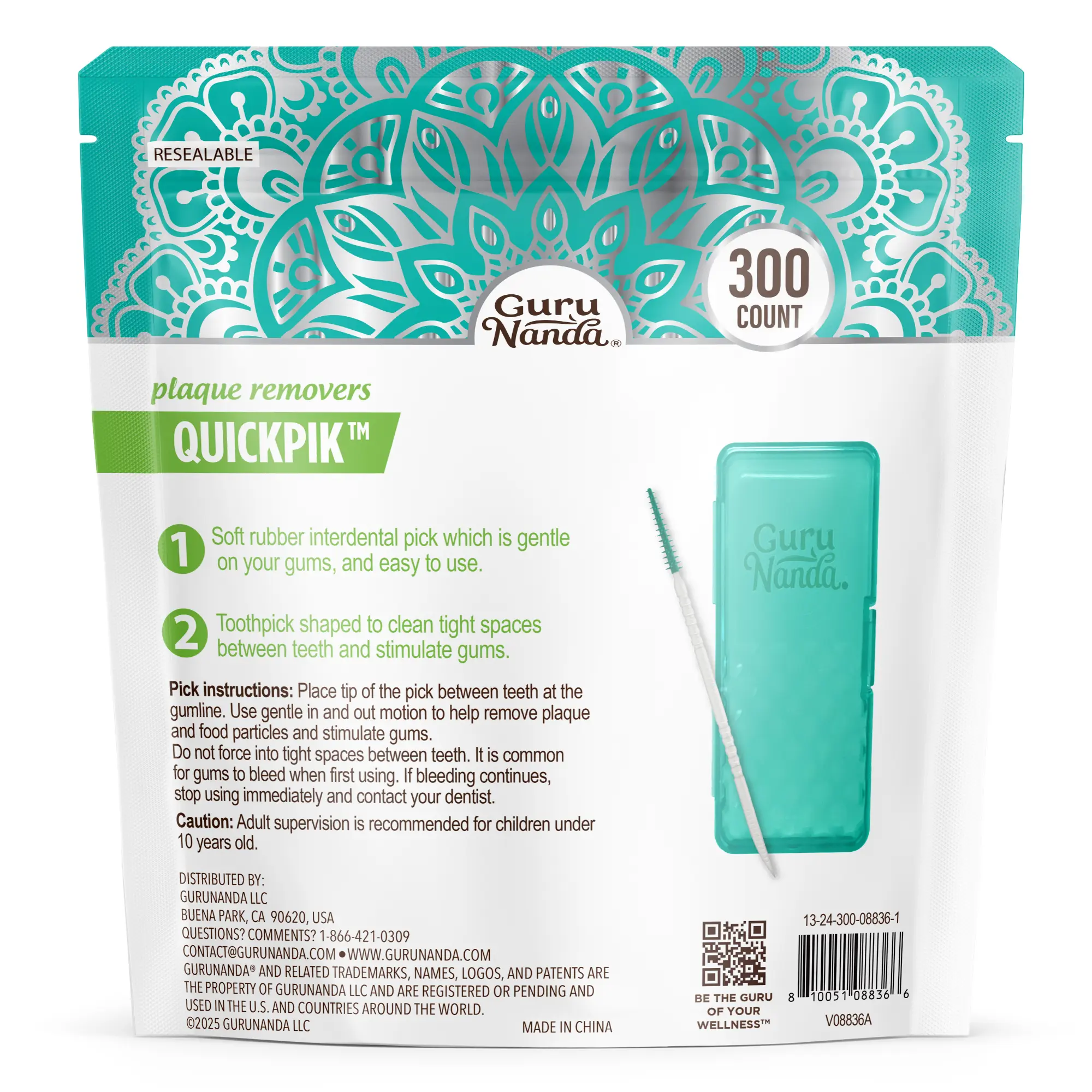 5. GuruNanda 2-in-1 QuickPik Toothpick with Interdental Pick- 300 Count - Plaque Removers - Travel Case Floss
