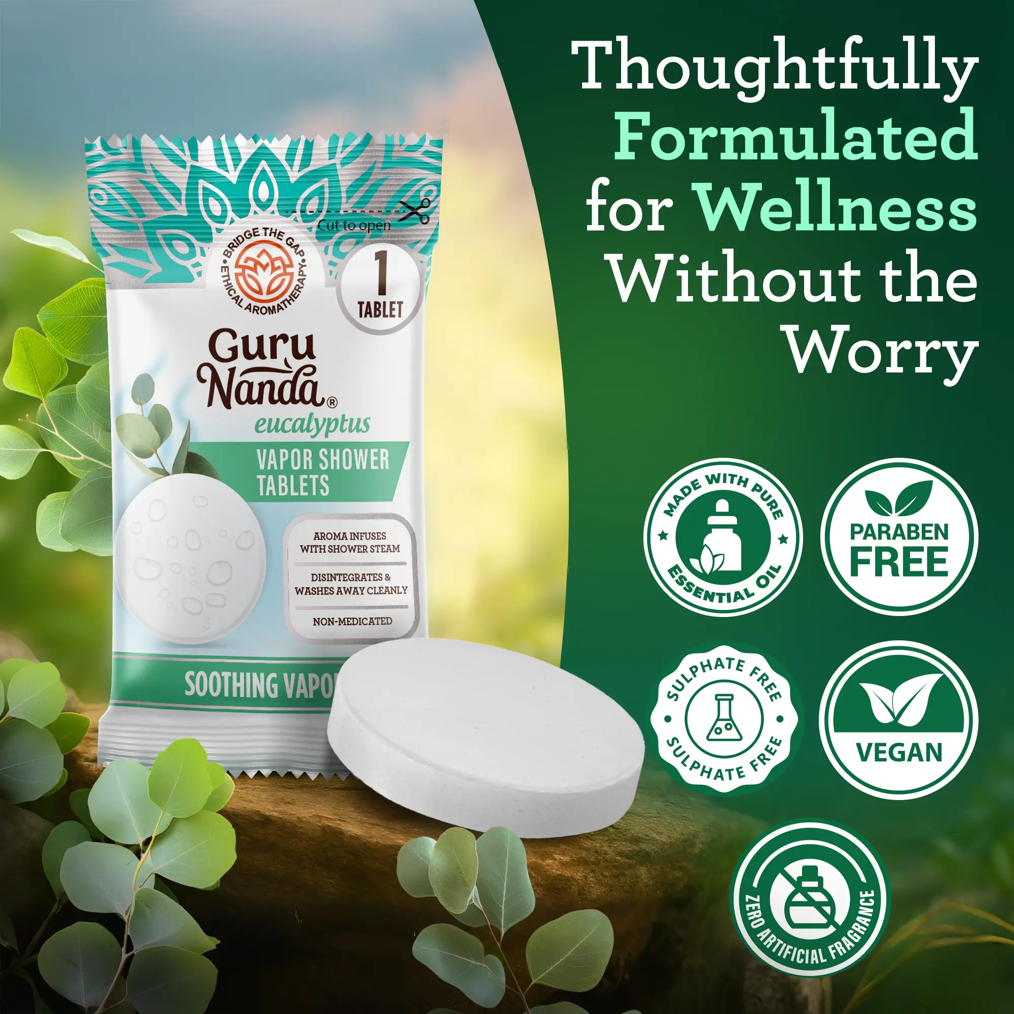 Revitalize with GuruNanda shower tablets, infused with 100% natural eucalyptus & menthol. They dissolve cleanly, releasing a long-lasting, refreshing aroma that elevates your mood and melts away stress. Enjoy an invigorating wave of fragrance by placing the tablet on the floor, just outside the water stream. Embrace self-care and relaxation with ease.