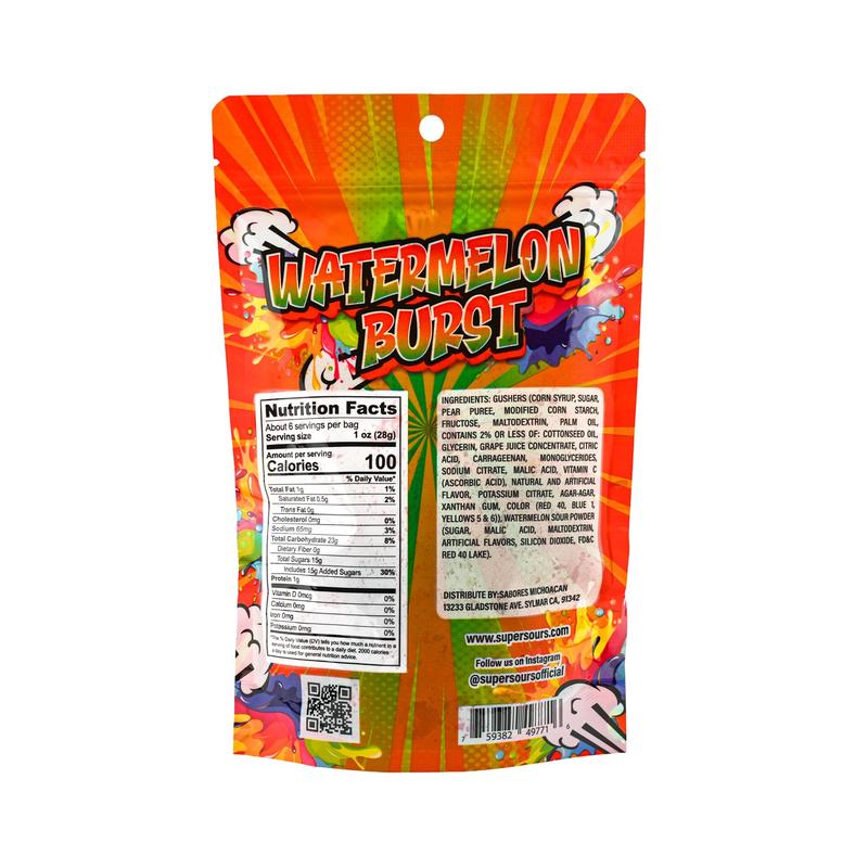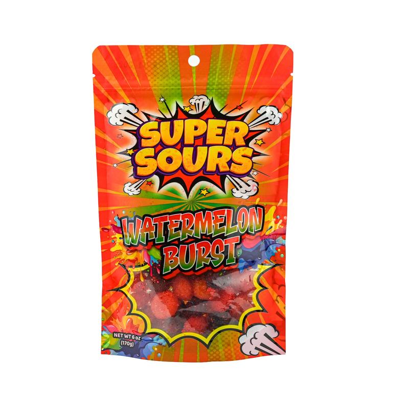 Super Sours Sour Watermelon Burst is a chewy candy that combines a tangy sour coating with a sweet, juicy watermelon flavor. Each piece delivers an intense flavor experience, making it a favorite among sour candy enthusiasts.