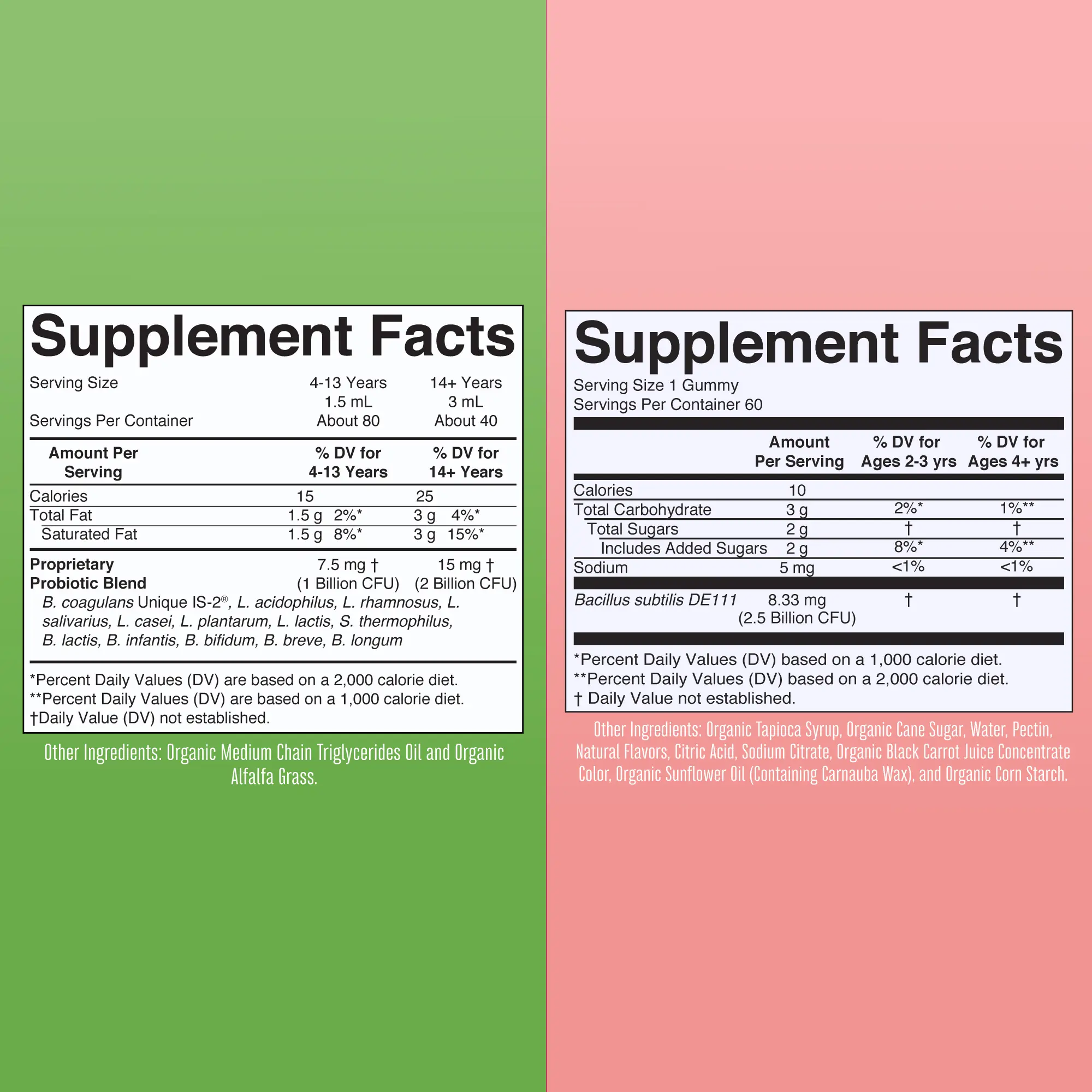 Support your and your child's gut, digestive health, and immune system with curated bundle pairing of our Organic Liquid Probiotic & Organic Kids Probiotic Gummies! Our easy-to-take liquid probiotic is unflavored and formulated with 13 unique probiotic strains, while the delicious strawberry-flavored kids gummies are the perfect probiotic for picky eaters!