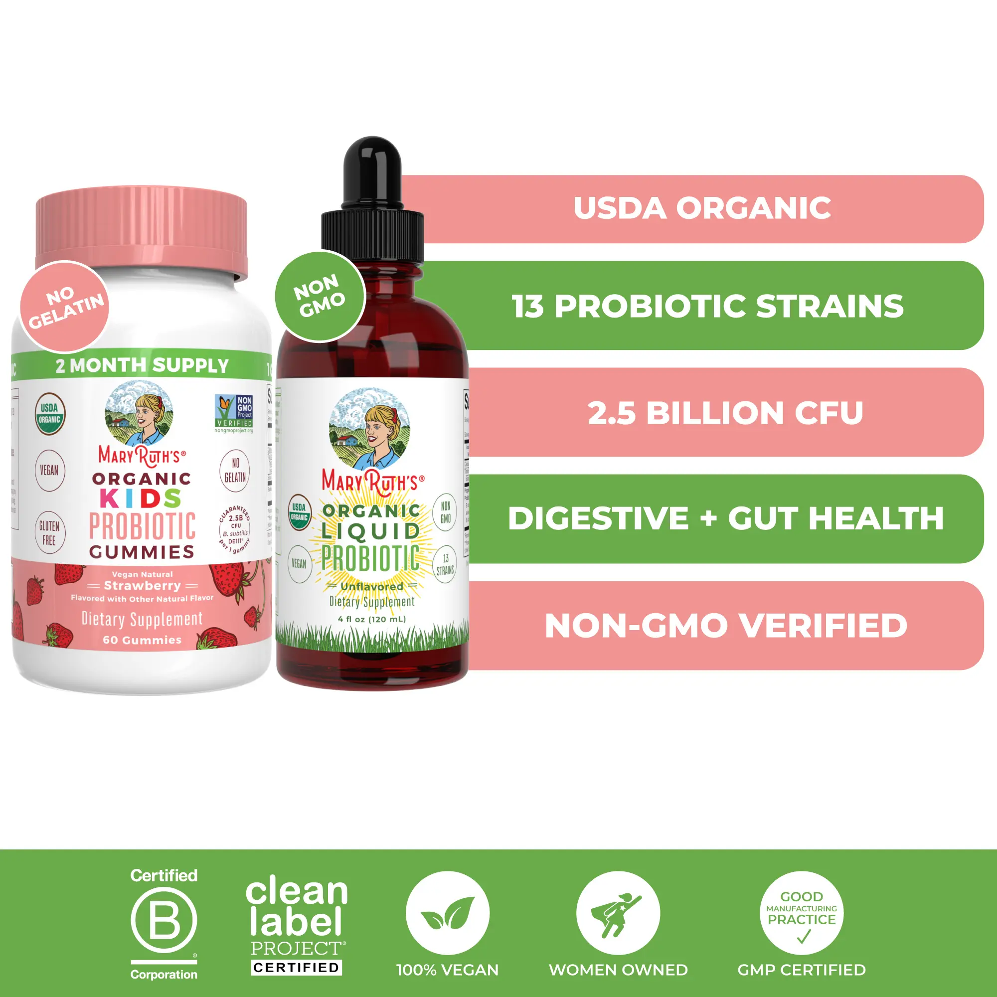 For Most Lifestyles: MaryRuth's Organic Probiotic Gummies for Children are USDA Organic, Non-GMO Project Verified, vegan,pectin based, no gelatin, no artificial colors, made in a GMP facility. Dairy free, nut free, gluten free, made with organic cane sugar. Clean Label Project Certified. B Corp Certified.