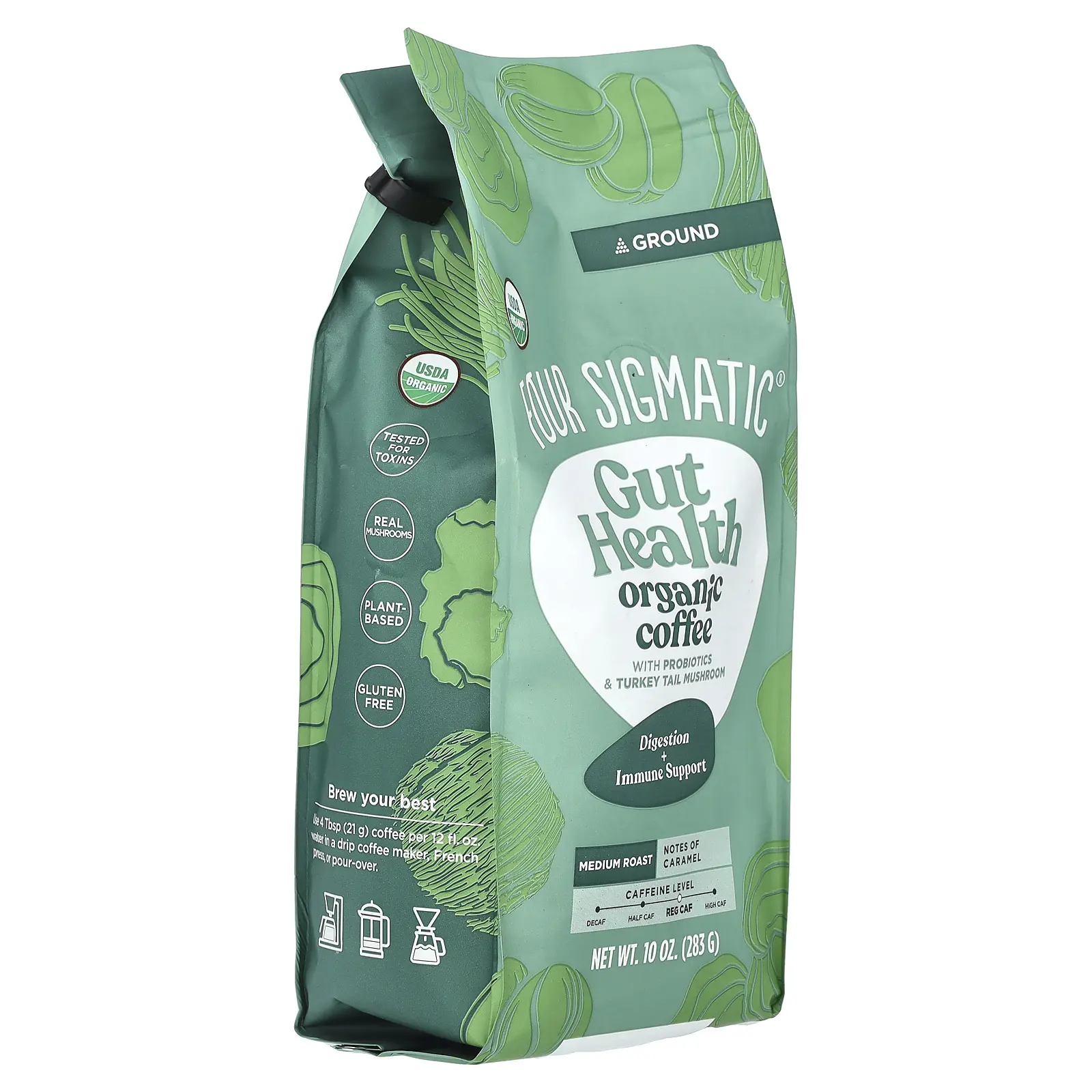 Four Sigmatic Gut Health, Organic Coffee with Probiotics and Turkey Tail Mushroom, Ground, Medium Roast, 10 oz (283 g)