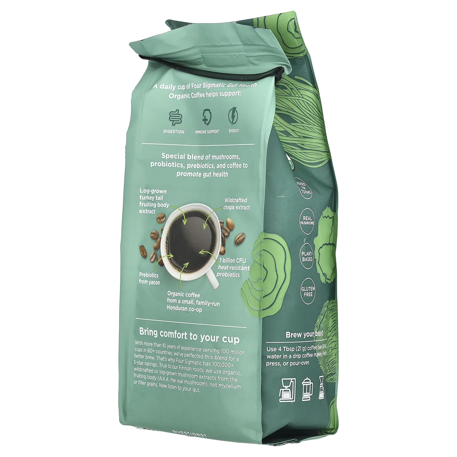 5. Four Sigmatic Gut Health, Organic Coffee with Probiotics and Turkey Tail Mushroom, Ground, Medium Roast, 10 oz (283 g)