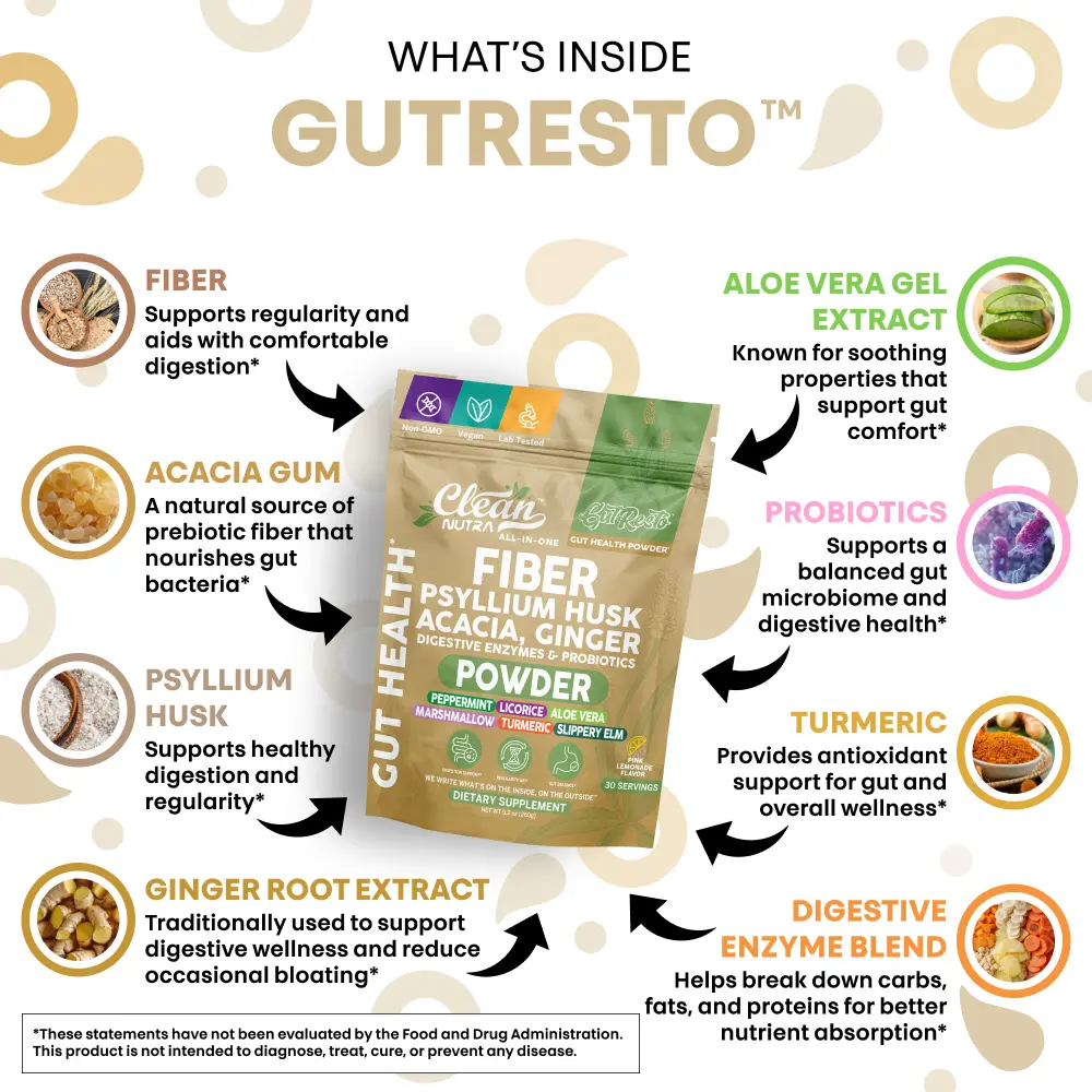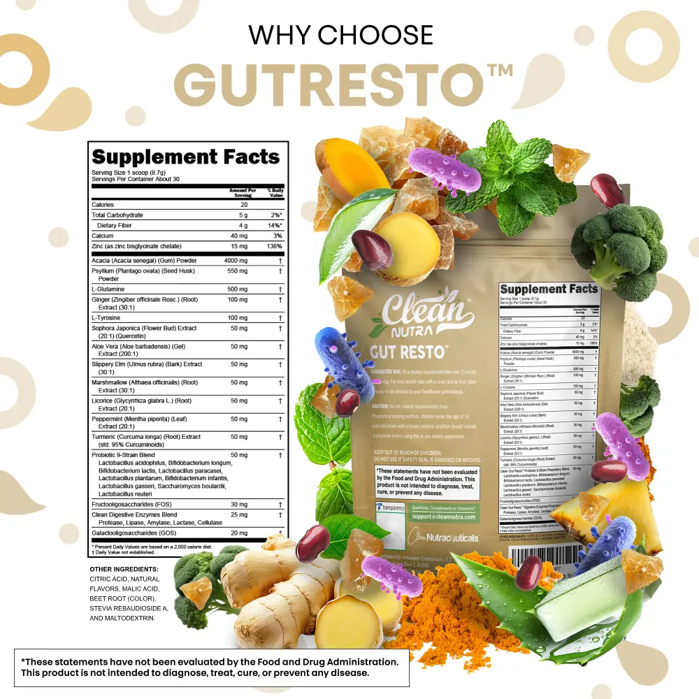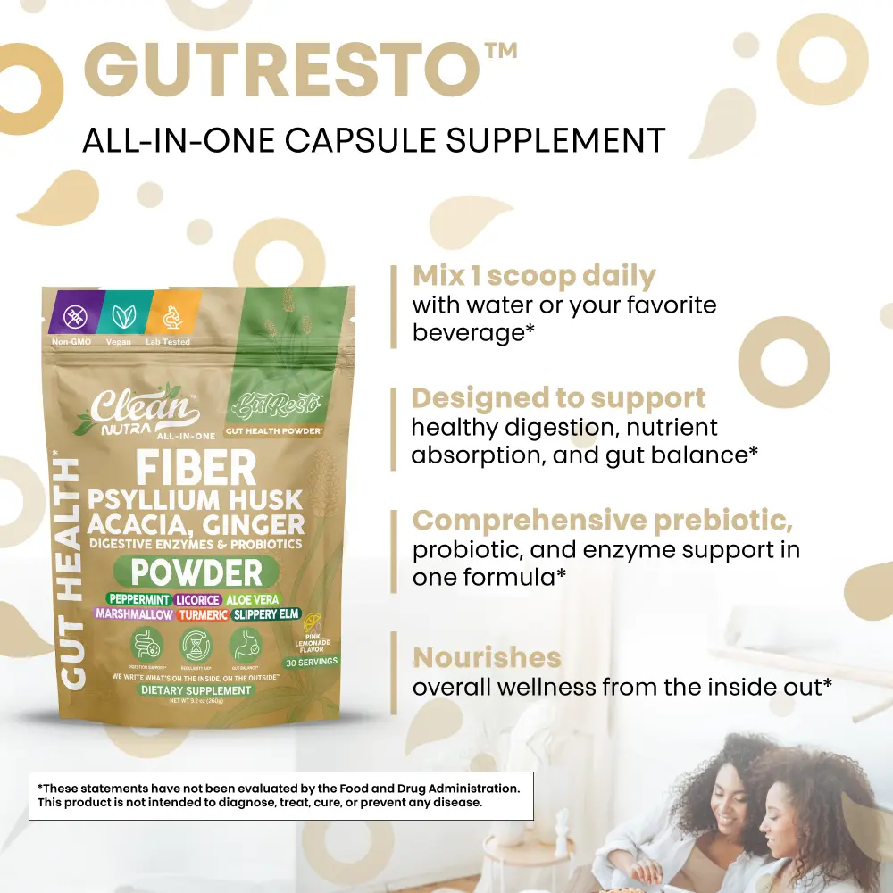 Gut Resto is an advanced gut health powder designed to support digestive balance and overall wellness. Featuring a blend of fibers, herbs, probiotics, and enzymes, this daily formula helps maintain digestive comfort while nourishing the body with natural plant-based ingredients.